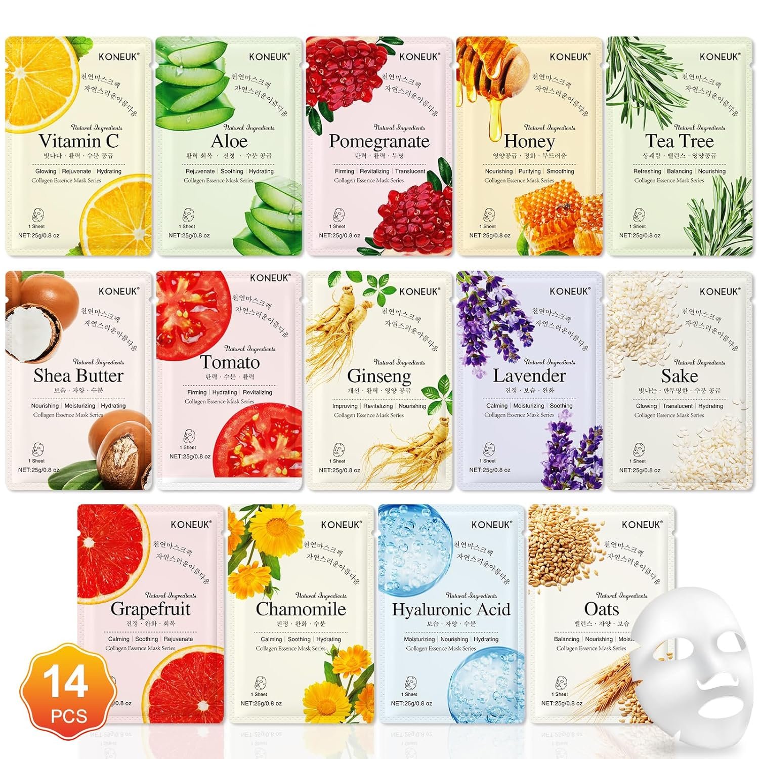 【14 Pack Face Mask Gift Set】Our facial sheet masks skincare with 14 ingredients like aloe,pomegranate,honey,tomato,ginseng,lavender,sake,oats,grapefruit,chamomile,hyaluronic acid,vitamin C,tea tree,shea butter.Rich collagen essence can be quickly absorbed by the skin,the skin will feel smoother and more moist.