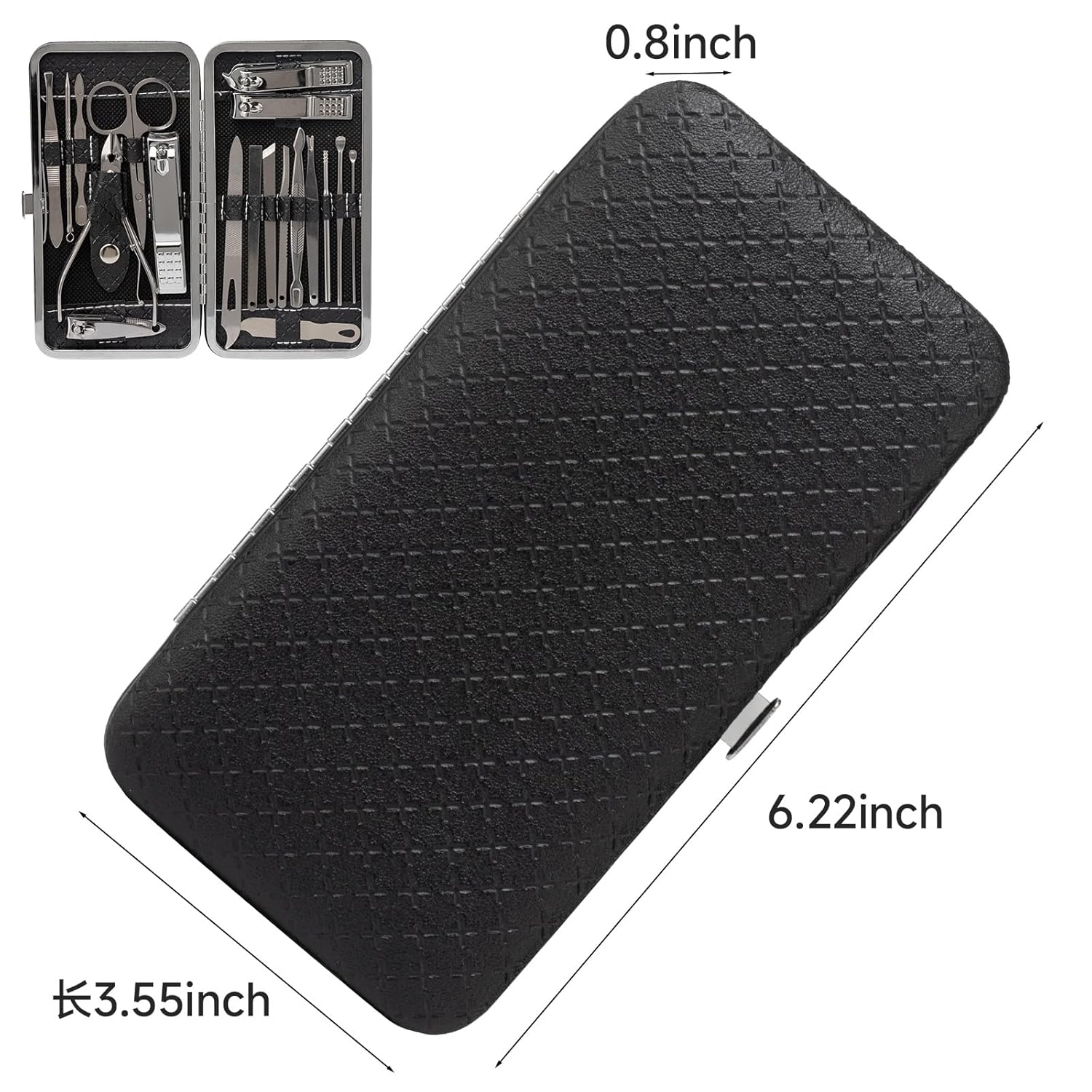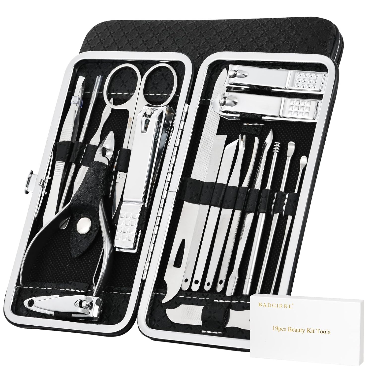 19pcs Beauty Kit Tools Includes toenail clipper, nail clipper, diagonal nail clipper, multi-purpose scissor, cuticle trimmer, ear pick, single-edged double-sided push stick, eyebrow tweezer, peeling knife, nail file, blackhead needle and loop remover, V-shaped push stick