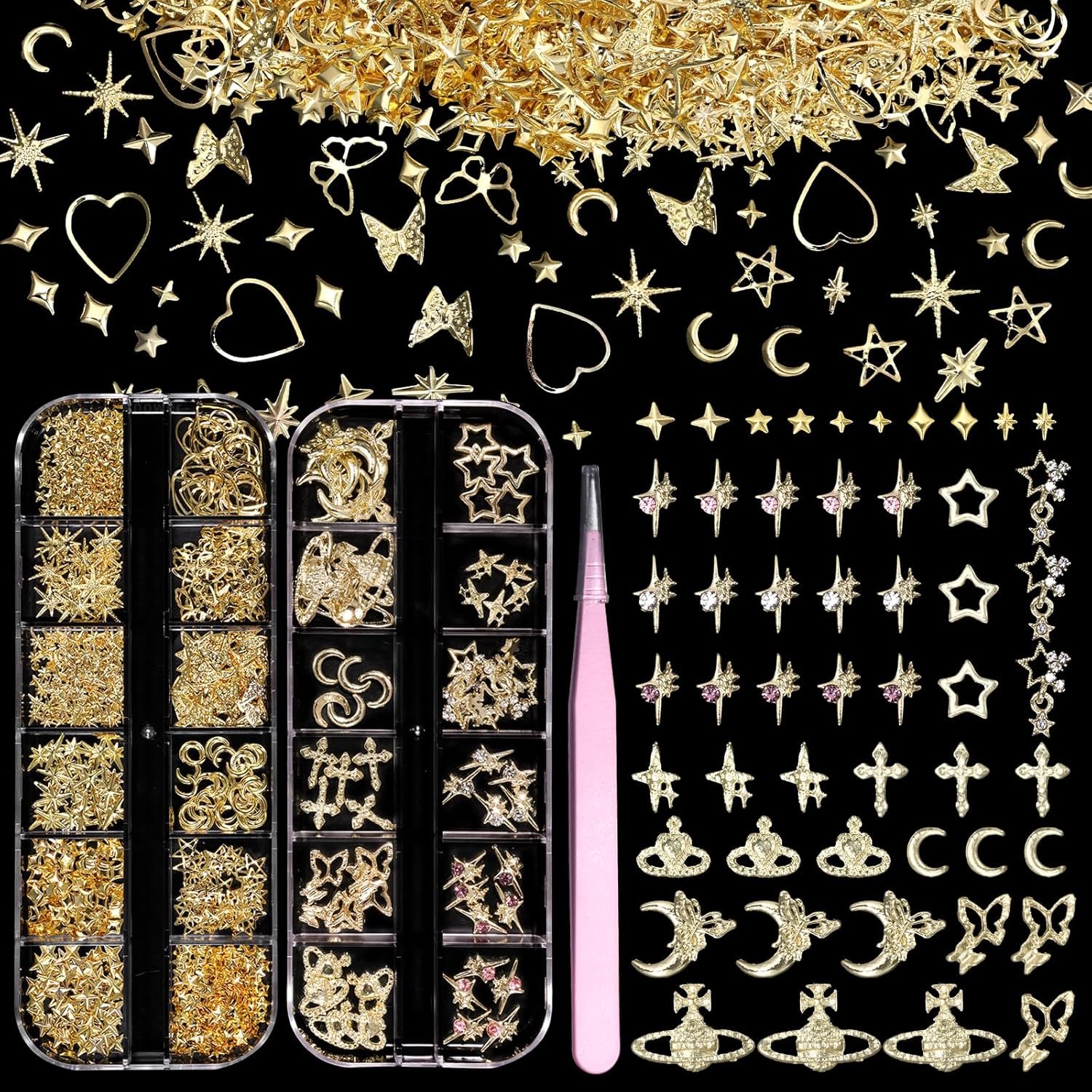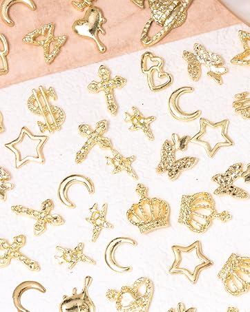 You Will Receive: Box-1 are 12-styles gold nail charms, including star, cross, butterfly, crown, moon and saturn gold nail charms and gems, total in 60 pcs. Box-2 are gold nail art studs set, including small star, moon, heart, butterfly and cross gold rivet nail charms
