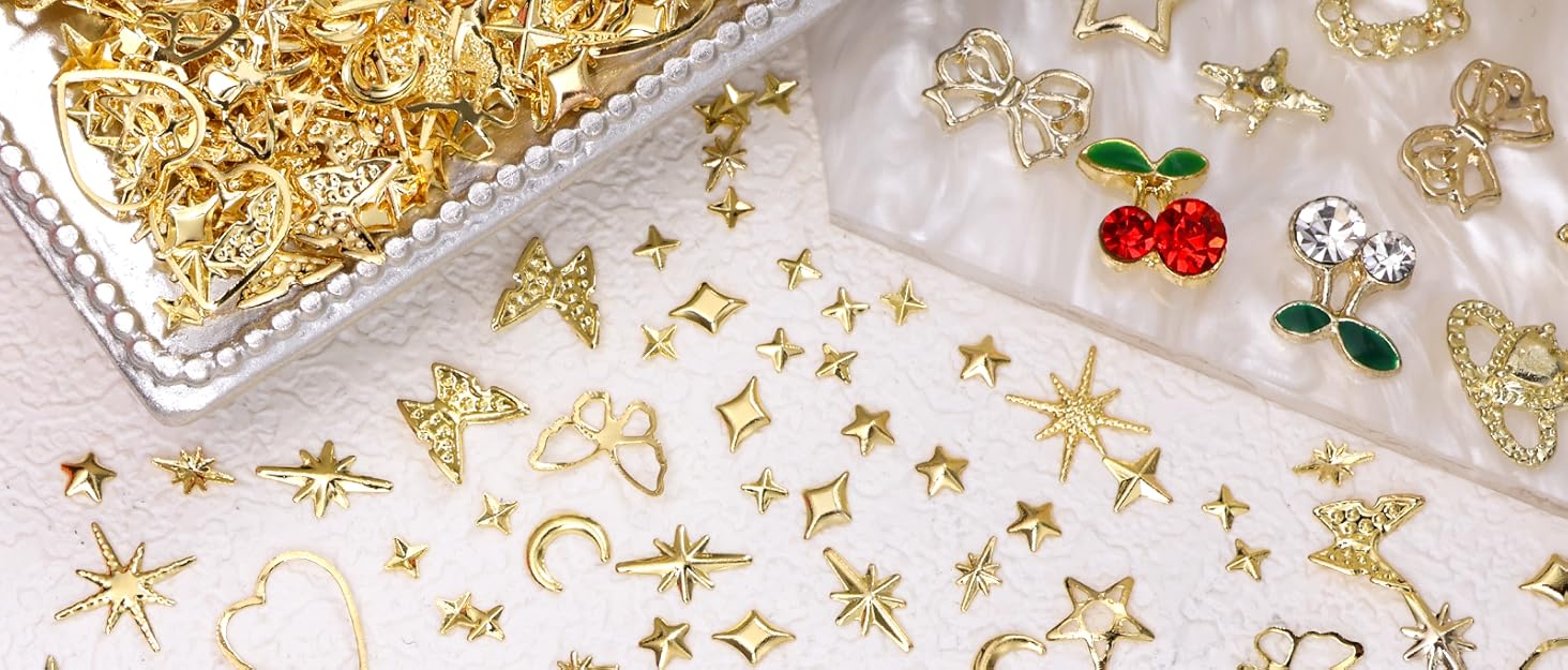 Gold Nail Charms: Gold star nail charms and gold nail studs are made of golden color alloy, which is light weight, clear in pattern, very shiny and not easy to fade to make your own unique nail art
