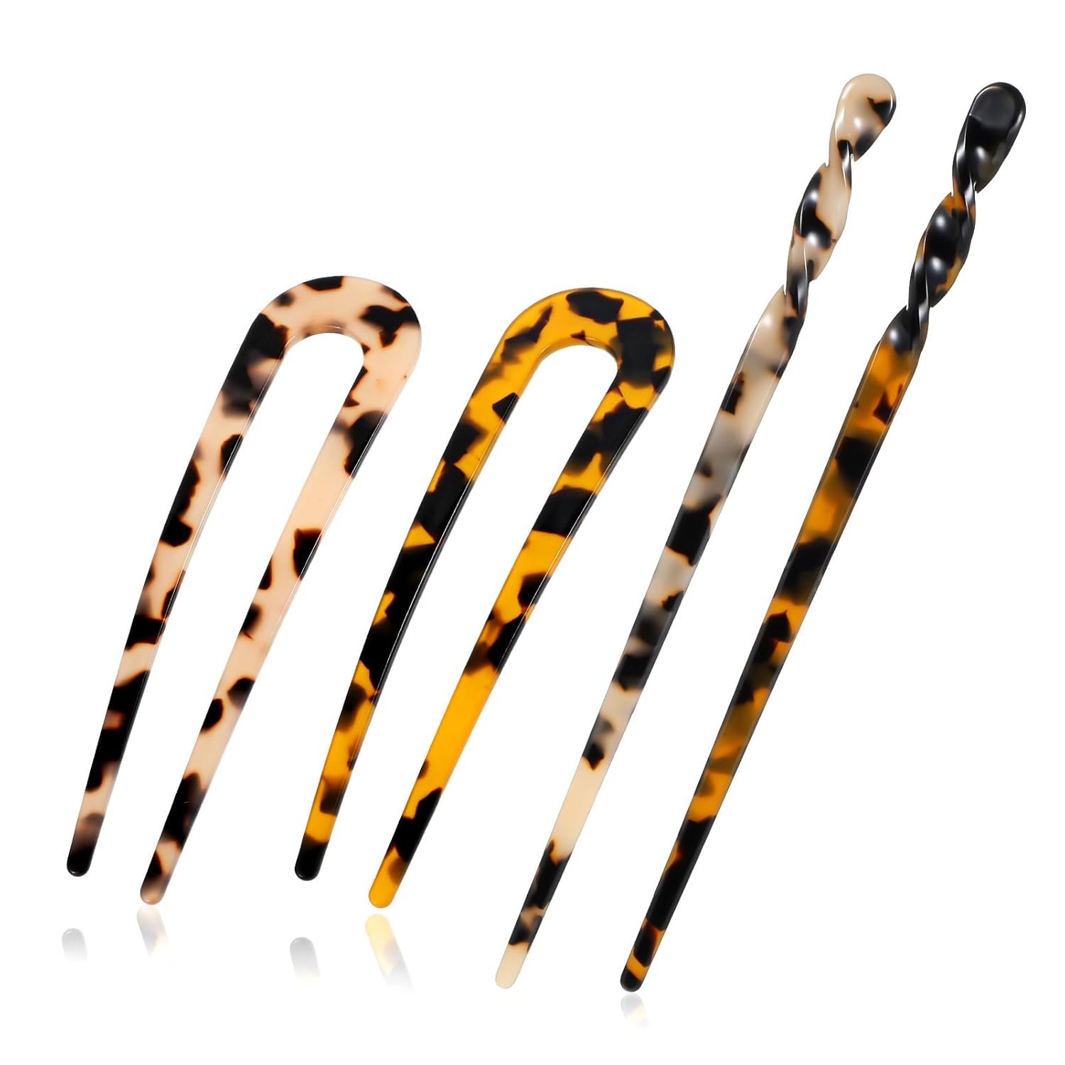 2 Pcs French Hair Forks + 2 Pcs Cellulose Acetate Hair Stick Tortoise Color U Shape Hairpins Updo Chignon Bun Hairstyle Accessories for Thick Long Curly Women Girls