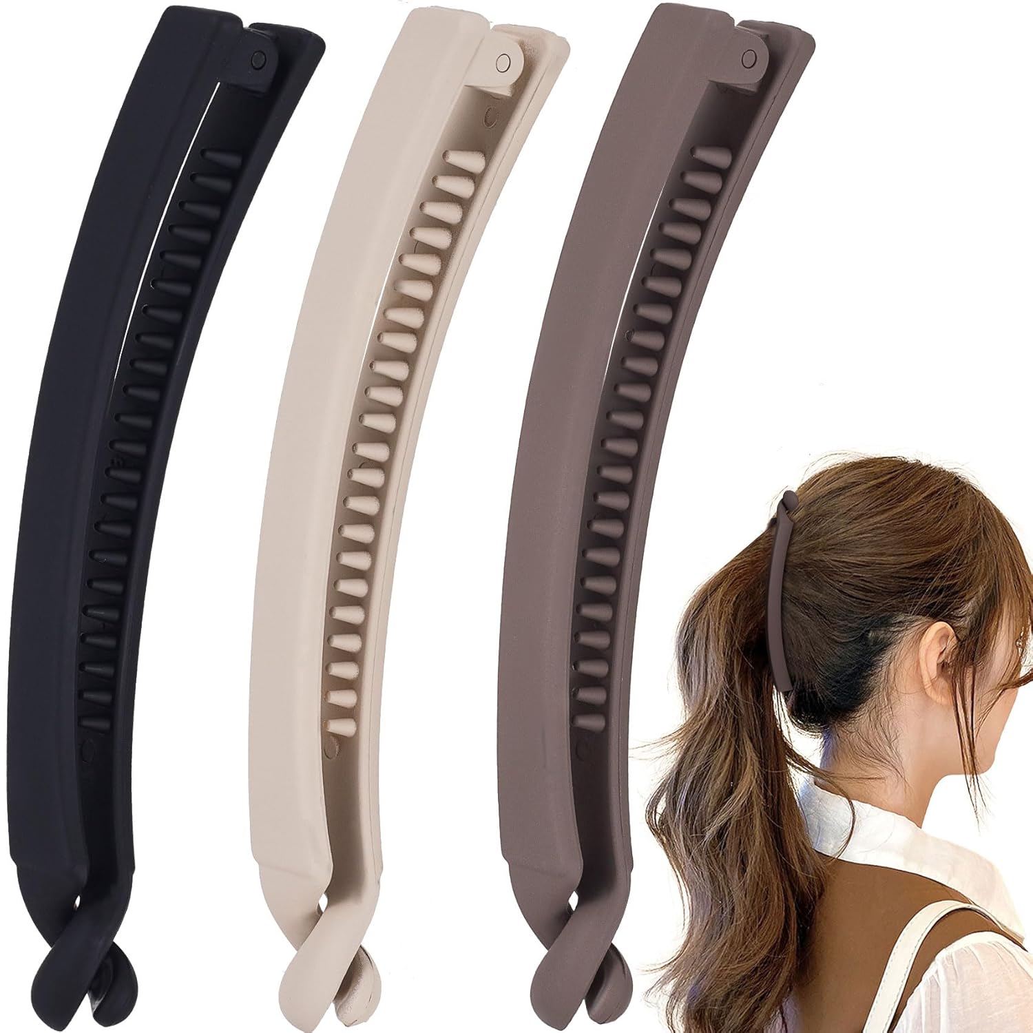 Package Include: You will get 3pcs banana hair clips in black, beige and dark coffee. The different colors allow you to change your hair accessory based on different outfits.