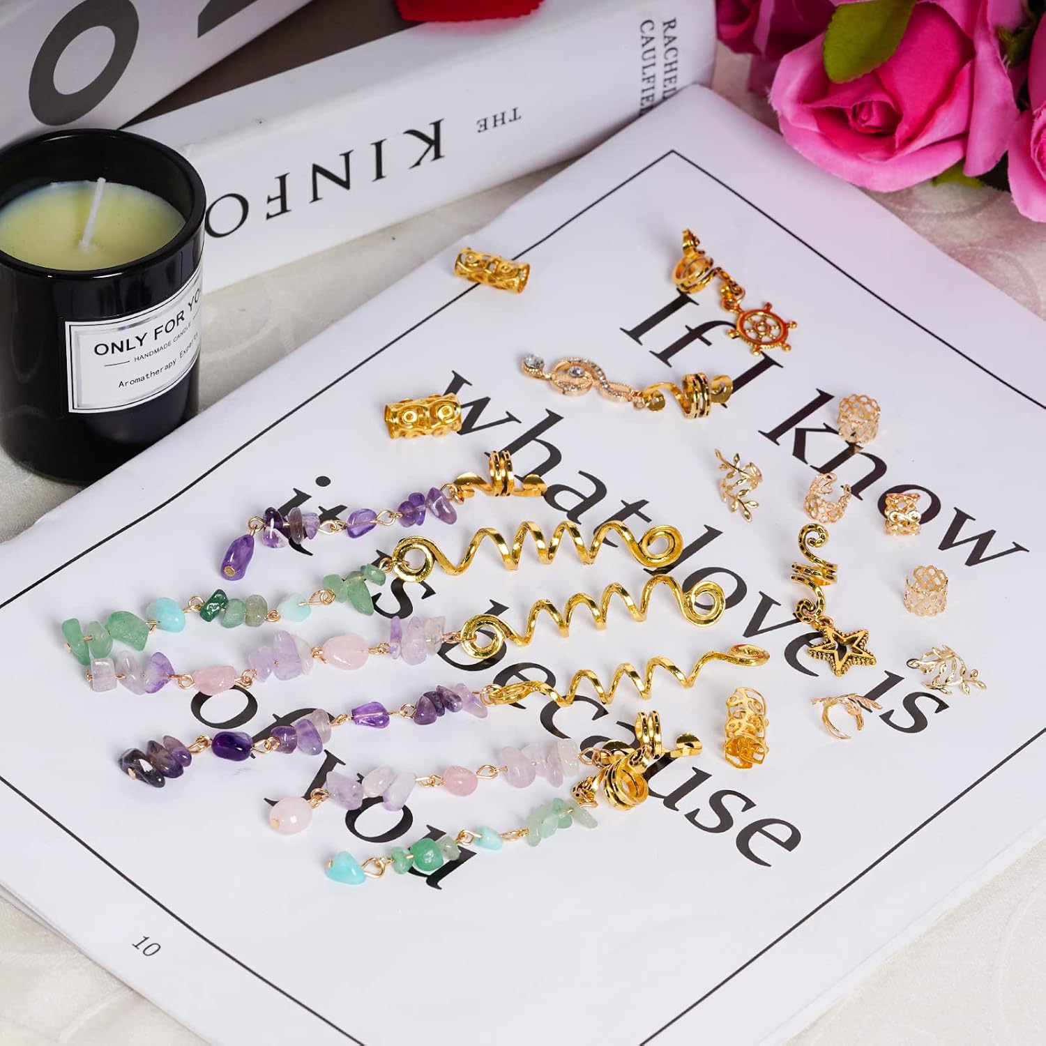 3 x 5.5inch colored crystal stones hair spiral pendant(pink, green, purple)3 x 3.5inch colored crystal stones hair spiral pendant(pink, green, purple)1 x star hair spiral pendant1 x turtle hair spiral pendant1 x sparkling rhinestone note hair spiral pendant1 x black beading Needle10 x 0.4inch gold dreadlocks cuff10 x 0.6inch gold dreadlocks cuff10 x 0.8inch leave-shaped gold dreadlocks cuff
