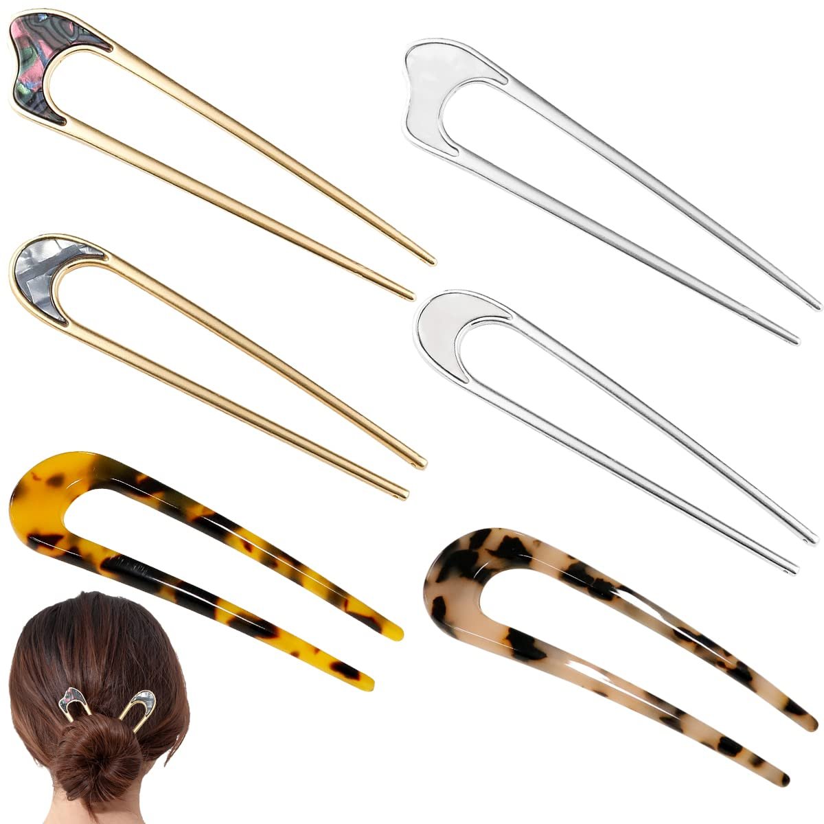 【What You Will Get】 You will receive 6 pieces of U shaped hair pins, including 3 styles, 2 pieces of each style. Style 1-irregular metal hair pin: 11×2.5×0.2cm/4.33×0.98×0.08inch; style 2-crescent metal hair pin: 10.5x2x0.2cm/4.13×0.79×0.08inch; style 3-tortoise shell cellulose acetate hair pin: 9.8×2.9×0.4cm/3.86×1.14×0.16inch.