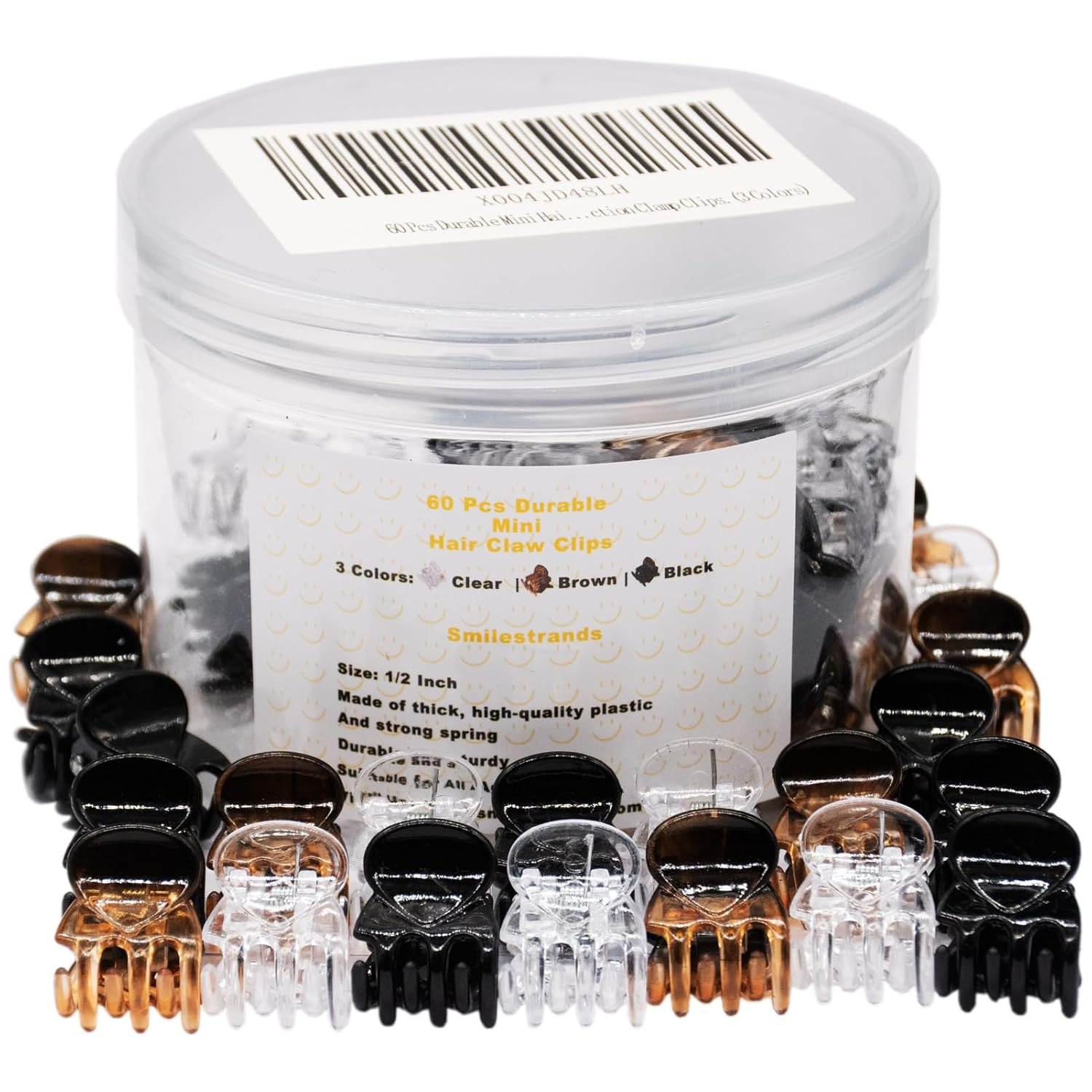 PACKAGE CONTENTS: Set of 60 mini hair clips in three stylish colors – tortoise brown, clear, and black, comes in a convenient storage jar