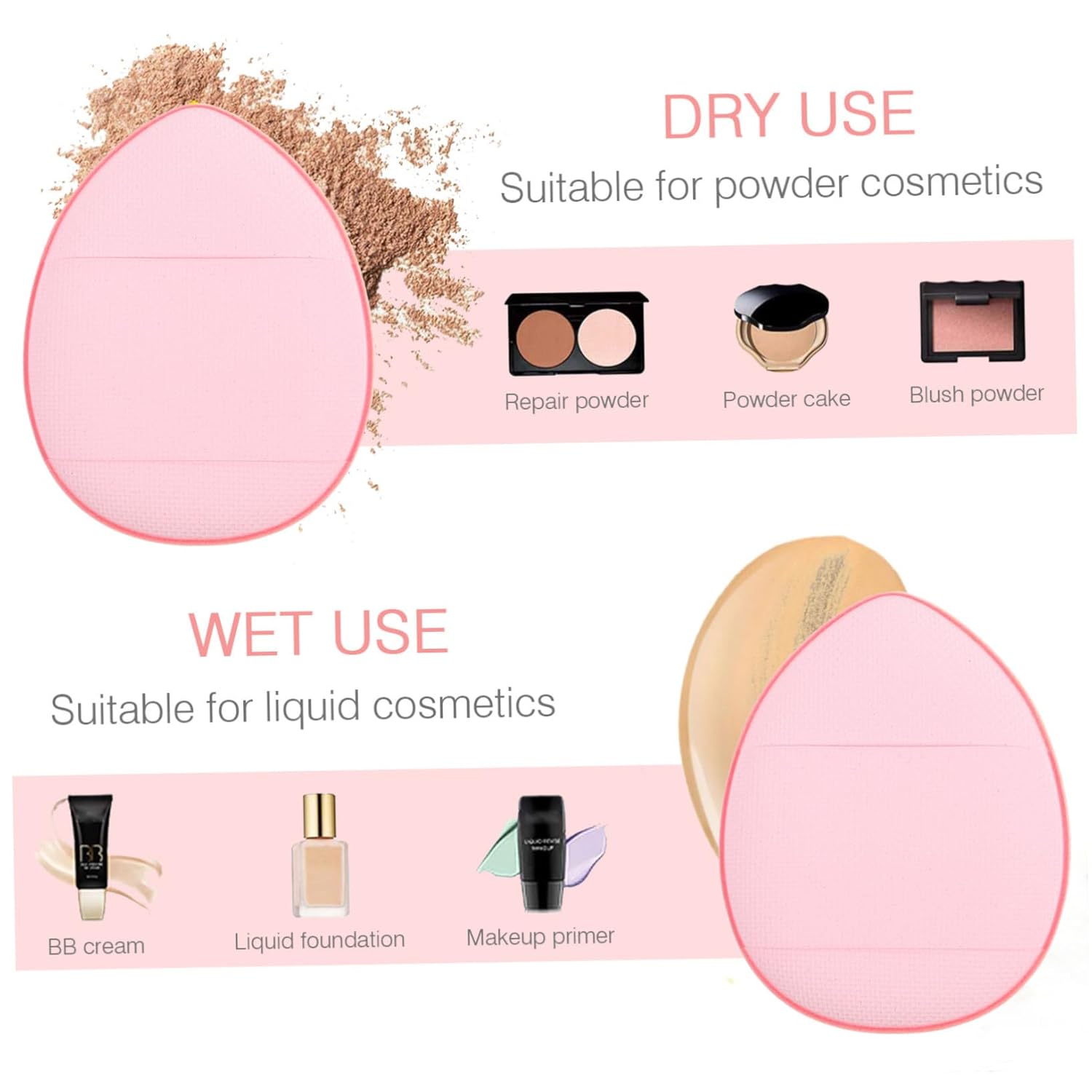 -They can be used dry or wet. Suitable for all kinds of skin even apply for skin makeup powder puff.