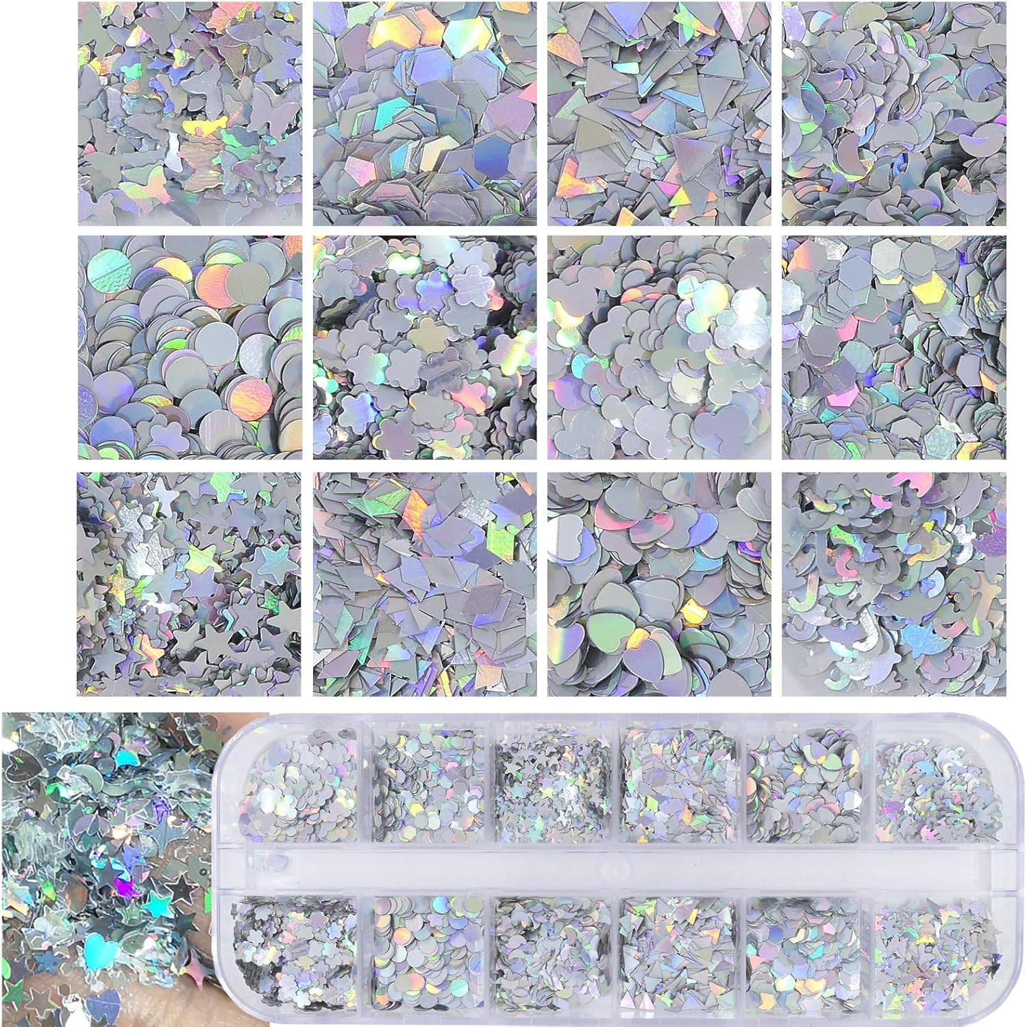WIDE APPLICATIONS: This nail glitters sequins can be decor your natural/false nails/UV Gel nail/acrylic nail. Also can works for greeting card crafting, Art & Crafts, resin epoxy project, girl slime party, books, shooes, bottle, cell phone case, face makeup, body, Christmas, perfect for all your sparkly crafting needs
