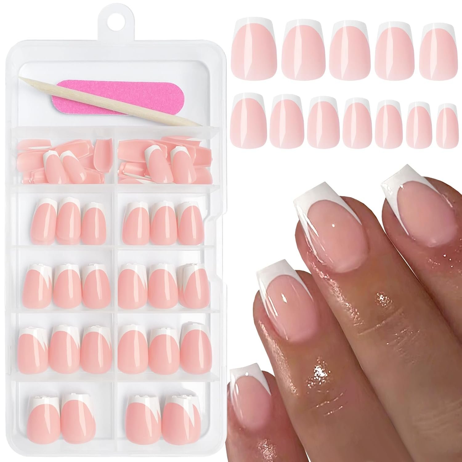 White french tips press on nails kit: content 120pc white french tips press on nails short coffin shape, 5 sheets nail adhesive tabs, 1 mini file, 1 wooden stick. we apply this short artificial nails kit with everything you need for a press-on nail manicure, easy to achieve salon effect at home