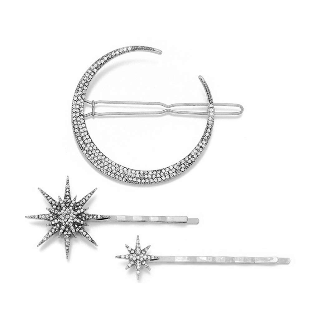 Color: Gold, SilverMoon: 5.6x 4.6 cm /2.20×1.81 inch; Snowflake: 6.7x 3.2 cm /2.64×1.26 inch; Star: 6.1x 1.4 cm /2.40×0.55 inchStyle: moon, snowflake, starQuantity: 3Pcs/SetPacking list: 3 Pcs Stars and Moon Vintage Rhinestone Hair Pin for Women Girls