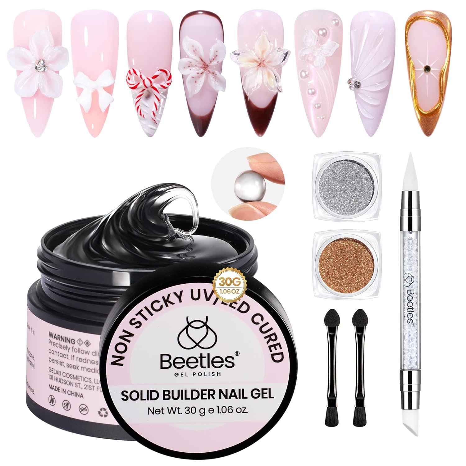With Dual-Ended Sculpture Pen: Comes with chrome nail powder and a thoughtfully designed dual-ended silicone pen. The silicone material resists sticking to the gel, while the dual-ended design allows for both broad and intricate detailing, ensuring a flawless finish for your nail art.(Tips:THE SOLID BUILDER GEL MAY BE HARD AT LOW TEMPERATURE,PLEASE PUT IT INTO WARM WATER FOR FEW MINUTES BEFORE USE.AND PLEASE KEEP THE 3D NAIL ART GEL IN A COOL PLACE WHEN THE WEATHER IS HOT. )