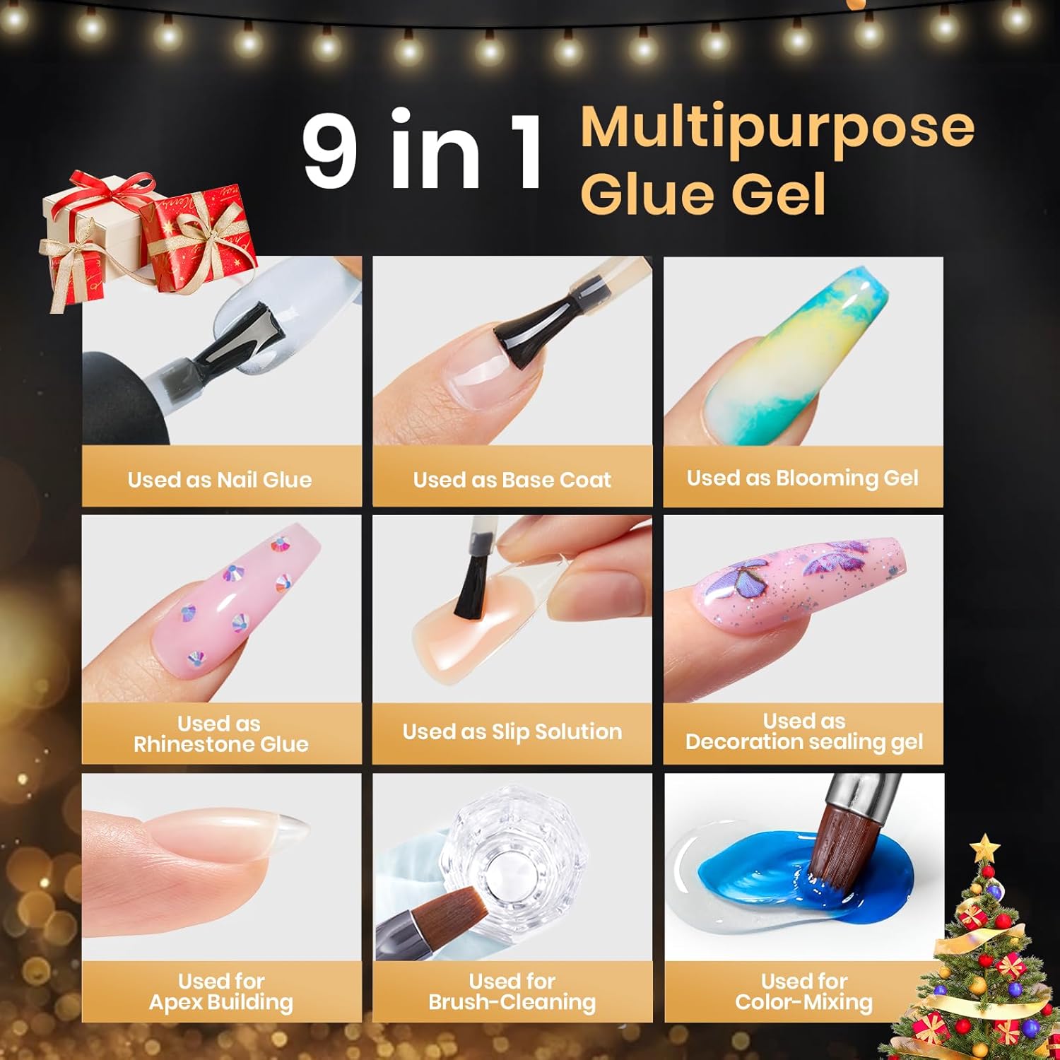 【9 In 1 Multipurpose Glue Gel】This Multi-functional Nail Gel is not only for nail tips adhesive, but also can be used as Base Gel! Moreover, it can be used as blooming gel, rhinestone, and slip solution.