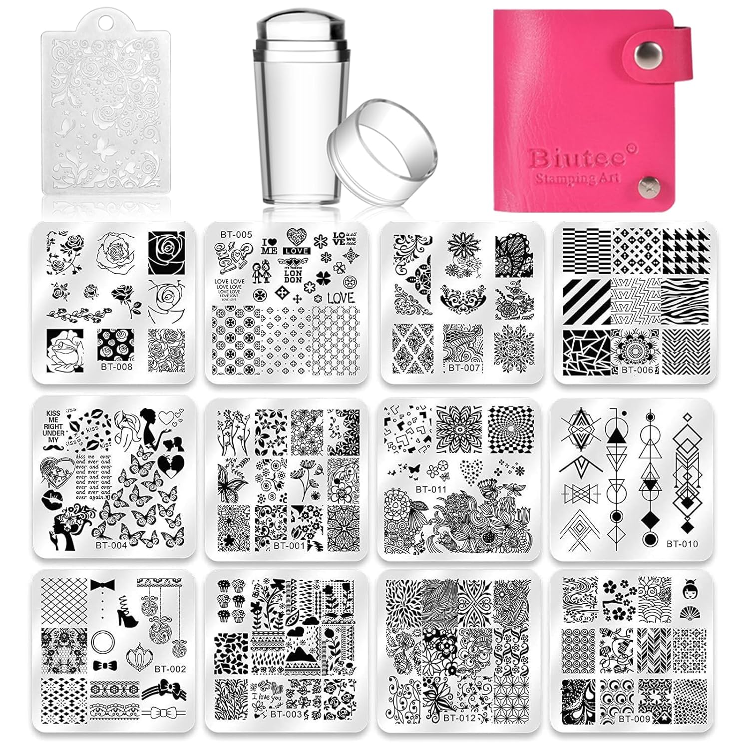 This link included 12pcs nail plates+1 stamper + 1scraper+1storage bag.All of our nail art plates are made of high quality stainless steels.