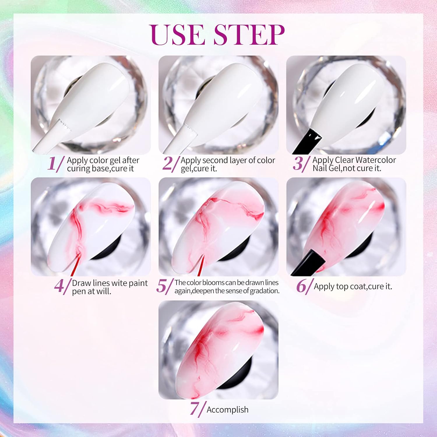 BLOOMING GEL WATERCOLOR EFFECT: Allowing you to create a beautiful blooming gel effect on gel nail polishes of any color. The blooming gel is transparent and can be used with any gel polish shade. With the BORN PRETTY blooming gel kit, you can easily create watercolor, airbrushed, marble, stripe, and floral nail art designs on top of any gel nail polish.