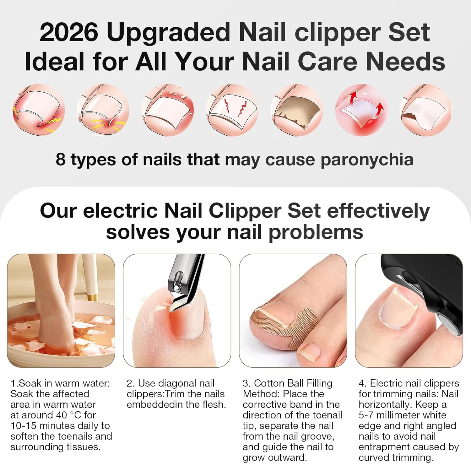 【Safe Design】This electric nail clipper set is specially designed for people who have difficulty using traditional nail clippers. It features high-strength alloy blades and an integrated bright LED light for precise trimming in low light conditions. It also comes with a concealed switch suitable for all ages (children, adults, and the elderly) to prevent accidental cuts and scratches. The set includes a pair of diagonal nail clippers to assist in dealing with ingrown nails, and ten cleaning stickers to maintain hygiene.