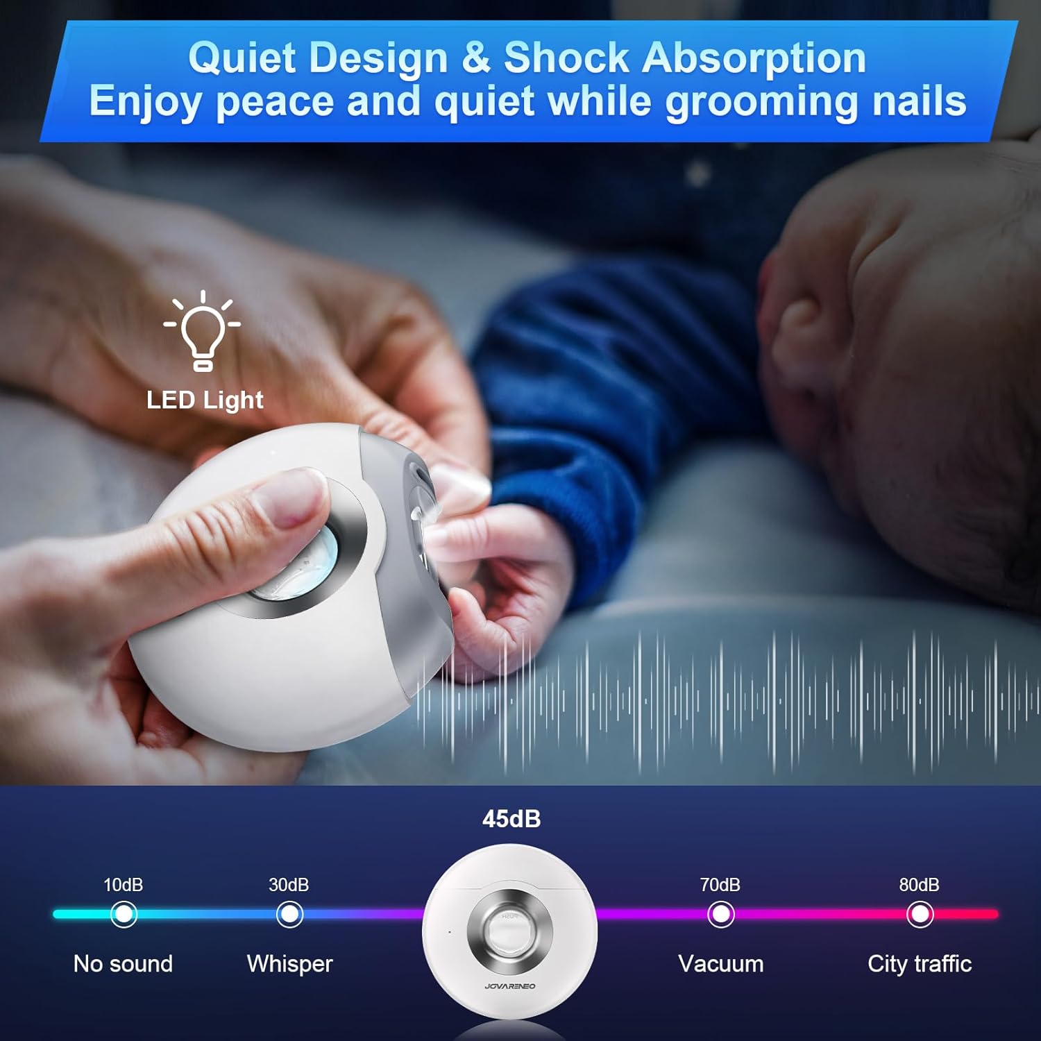 Quiet Operation with LED Light: Powered by a ≤45dB ultra-quiet motor(like a whisper), this electric nail grinder ensures silent trimming even while your baby is sleeping without disturbing them. Built-in soft LED light provides clear visibility in low-light conditions for precise trimming.