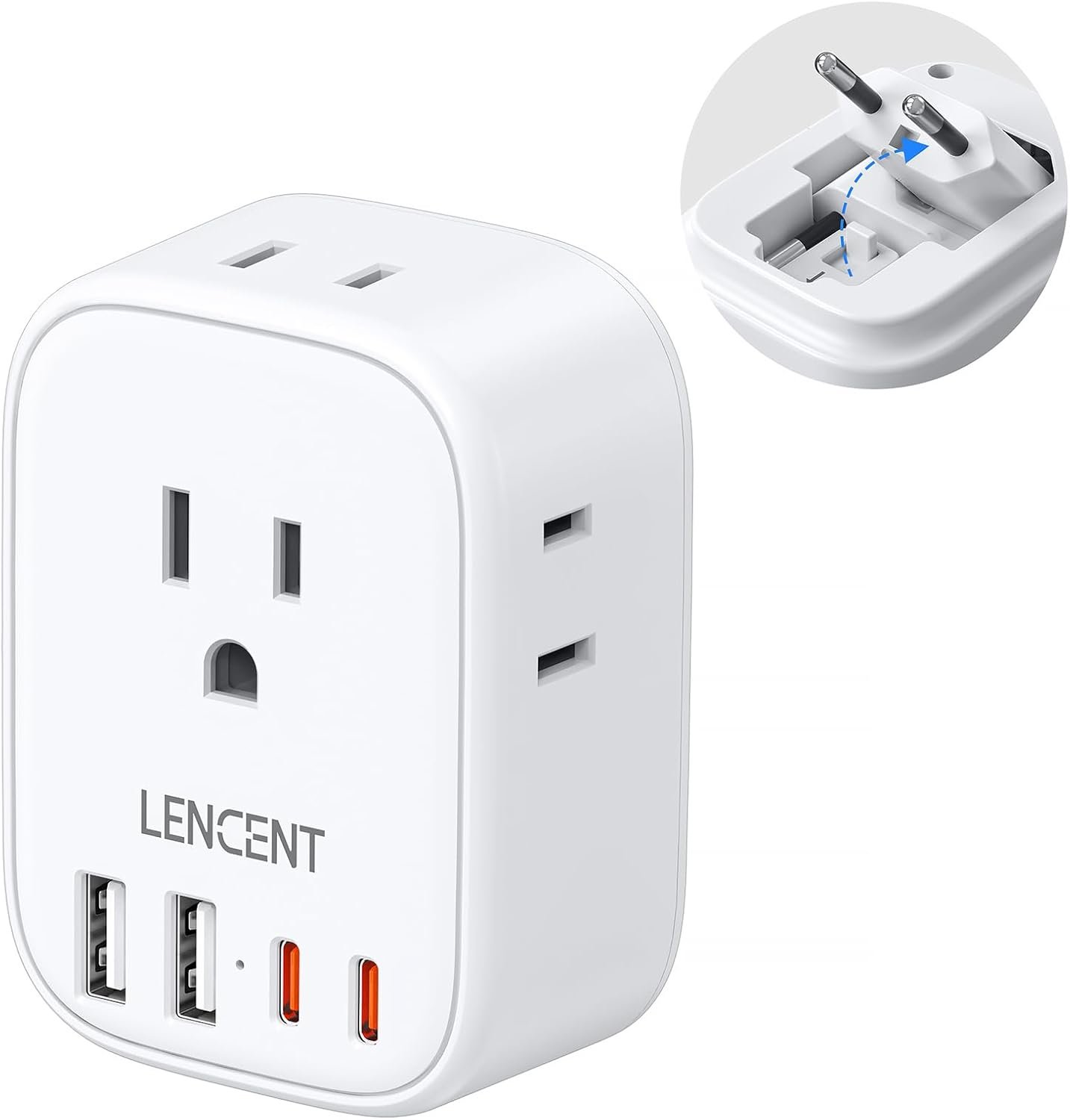 【8-IN-1 European Power Adapter】The European travel plug adapter turns one European Type C socket into 4 American AC outlets and 4 USB charging ports. Max Capacity Up to 2500 Watt (max 250 Volt, 10 A). 4-side design can charge 8 devices simultaneously without blocking. No need to carry extra adapters and power strip for your trip. Grab it and GO!