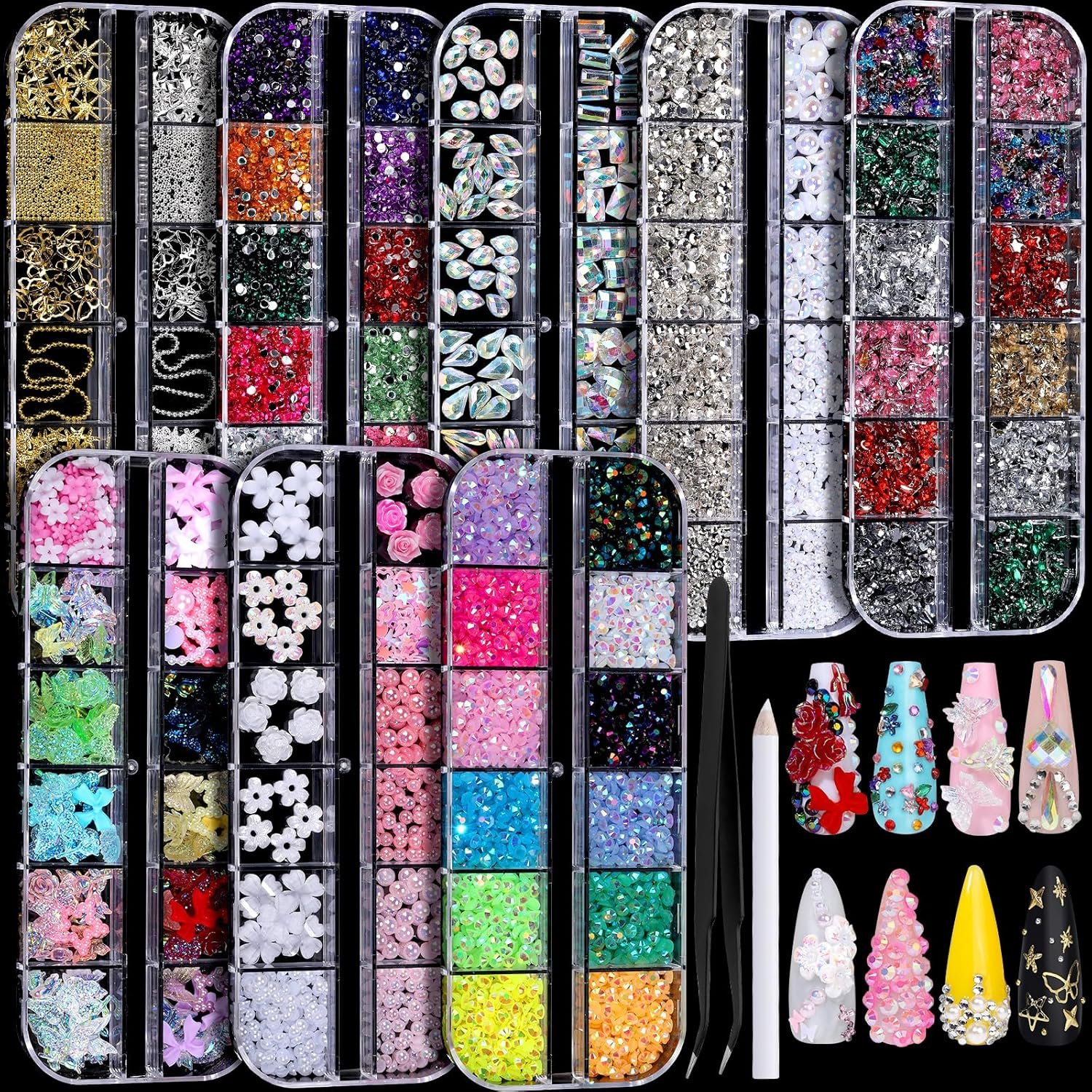 Nail Charms Kit with 8 Varieties&Tools:FANDAMEI nail charms set includes various choices for stunning manicures: 1 box white flatback AB pearls&clear rhinestones for nails, 1 box mixed colorful 3D nail charms, 1 box 3mm candy-colored nail diamonds, 1 box mini multi shape nail art charms, 1 box gold/silver studs with chains, 1 box white/pink AB flowers pearls, 1 box 12-shape AB gems for crafting and 1 box colorful flatback rhinestones. Plus, 1 wax pencil and 1 tweezer for precise application.