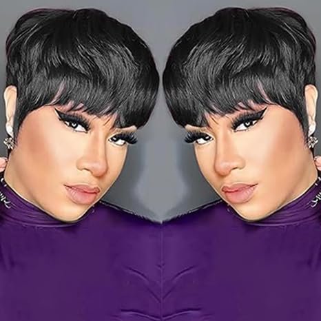 2. Color: black wigs; Weight: about100g; Length: Short pixie cut hair wig ; Hair material :Synthetic wig