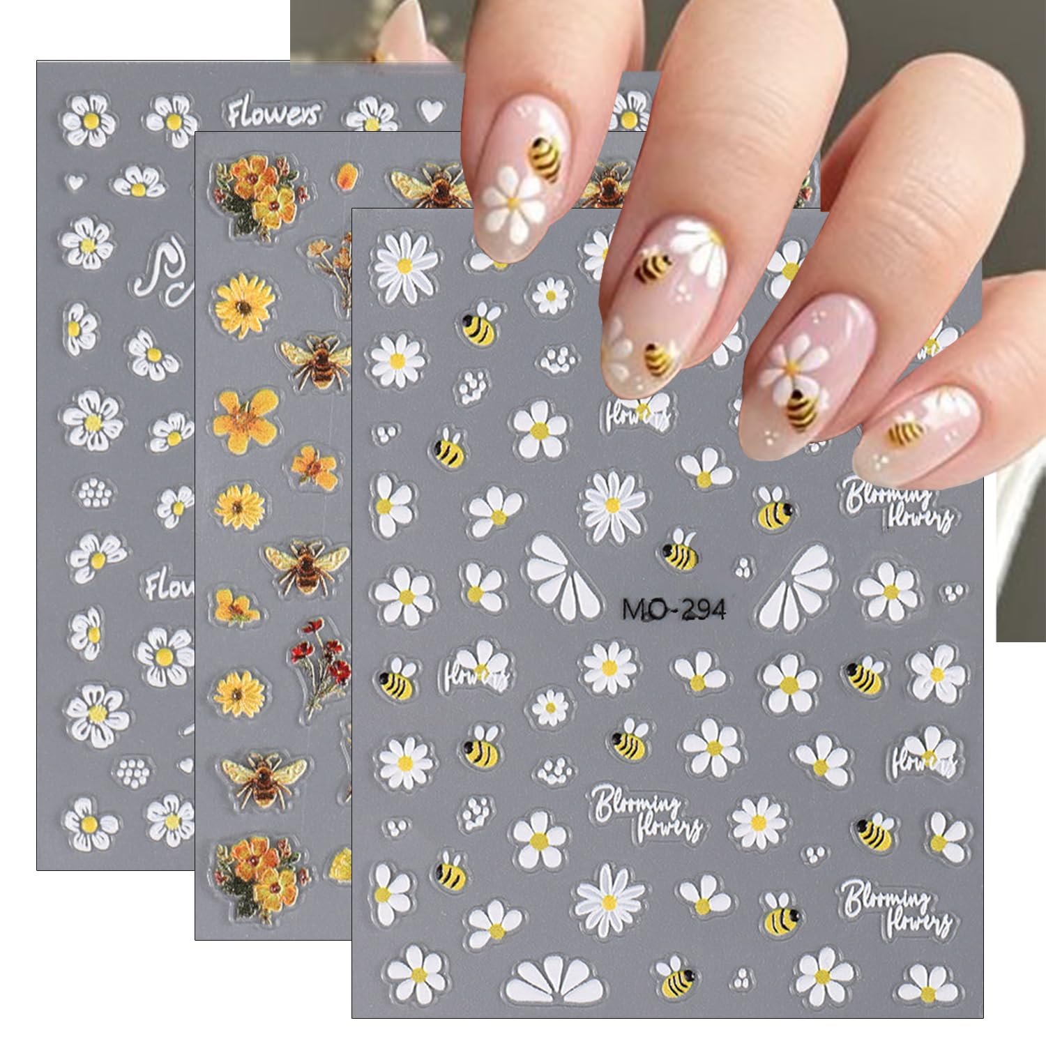 Flower Nail Design: You will get 3 sheets classical white daisy nail stickers, 5D embossed cute bee nail art sticker, fall flower nail decals, bring you more DIY manicure tip decorations choices