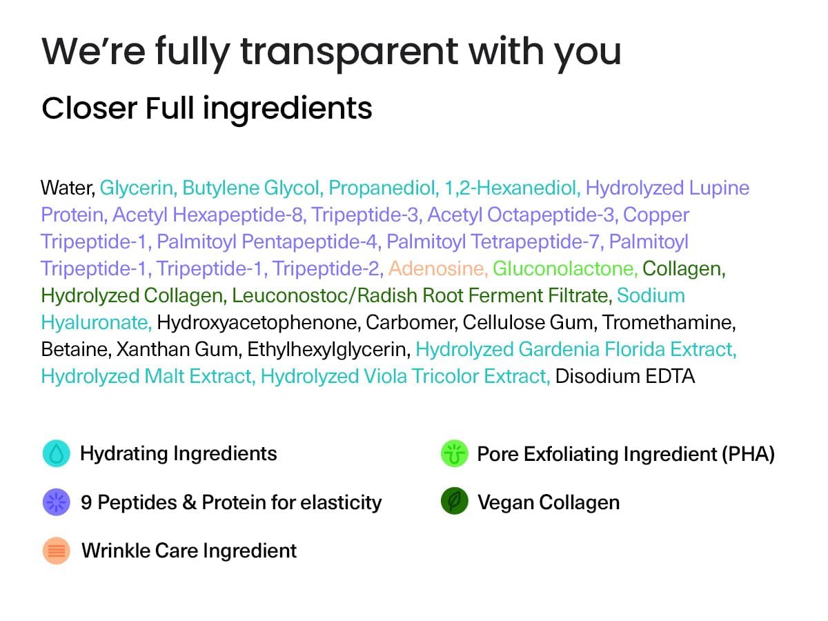 INSTANT RADIANCE AND BOUNCY SKIN: The synergy of nine peptides, adenosine, and vegan collagen creates a bouncy, glowing complexion, revitalizing your skin’s healthy radiance.