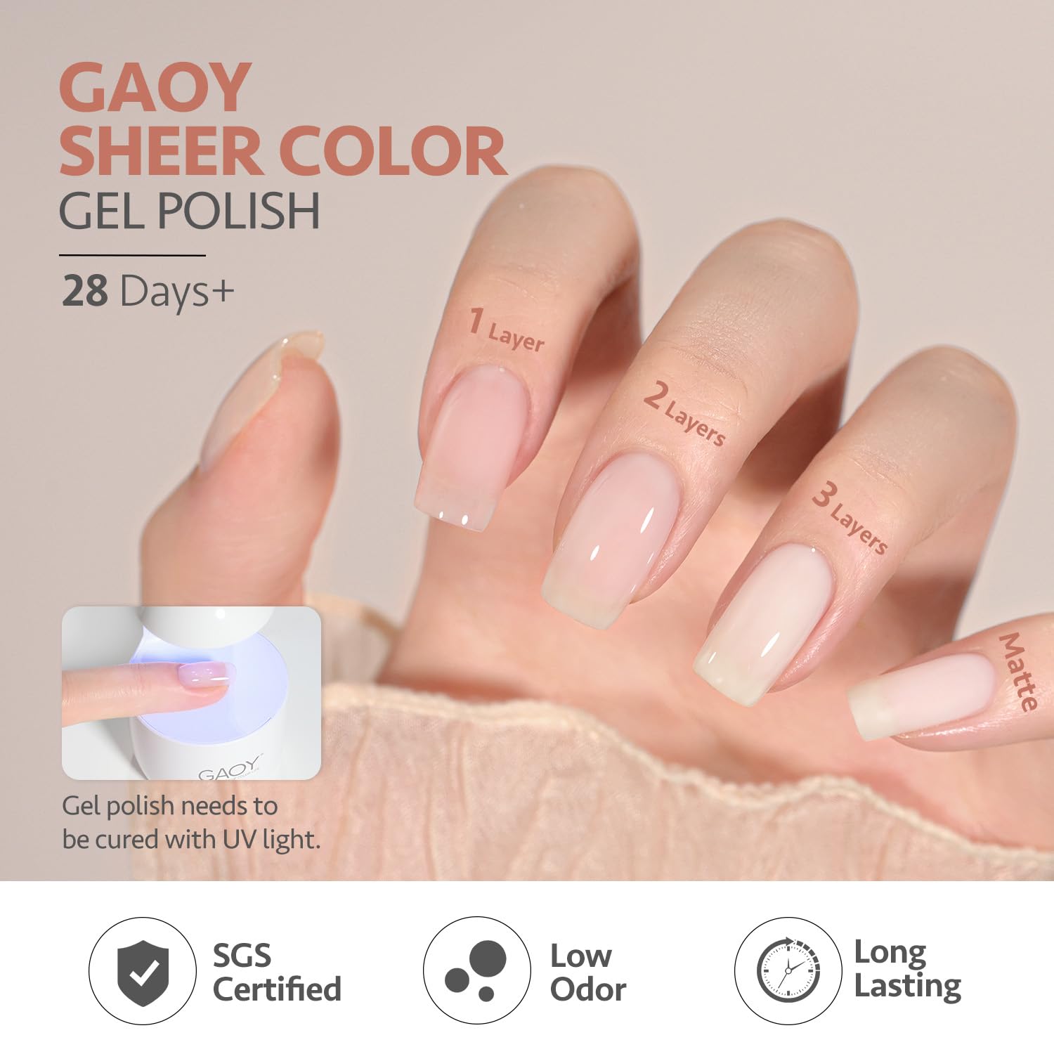 Sheer Gel Polish: Apply several layers to build up the color from clear translucent to solid opaque.