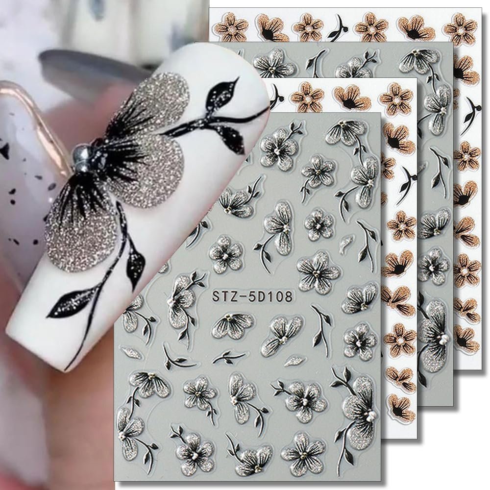 Glitter Flower Nail Art Stickers 5D Black Silver Flower Nail Stickers 3D Black Gold Flower Stickers for Nails Floral Nail Decals For Nail Art Supplies Jelly Blossom Sticker Nails Petals Nail Decor