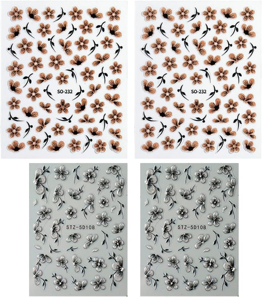 Glitter Flower Nail Art Stickers 5D Black Silver Flower Nail Stickers 3D Black Gold Flower Stickers for Nails Floral Nail Decals For Nail Art Supplies Jelly Blossom Sticker Nails Petals Nail Decor