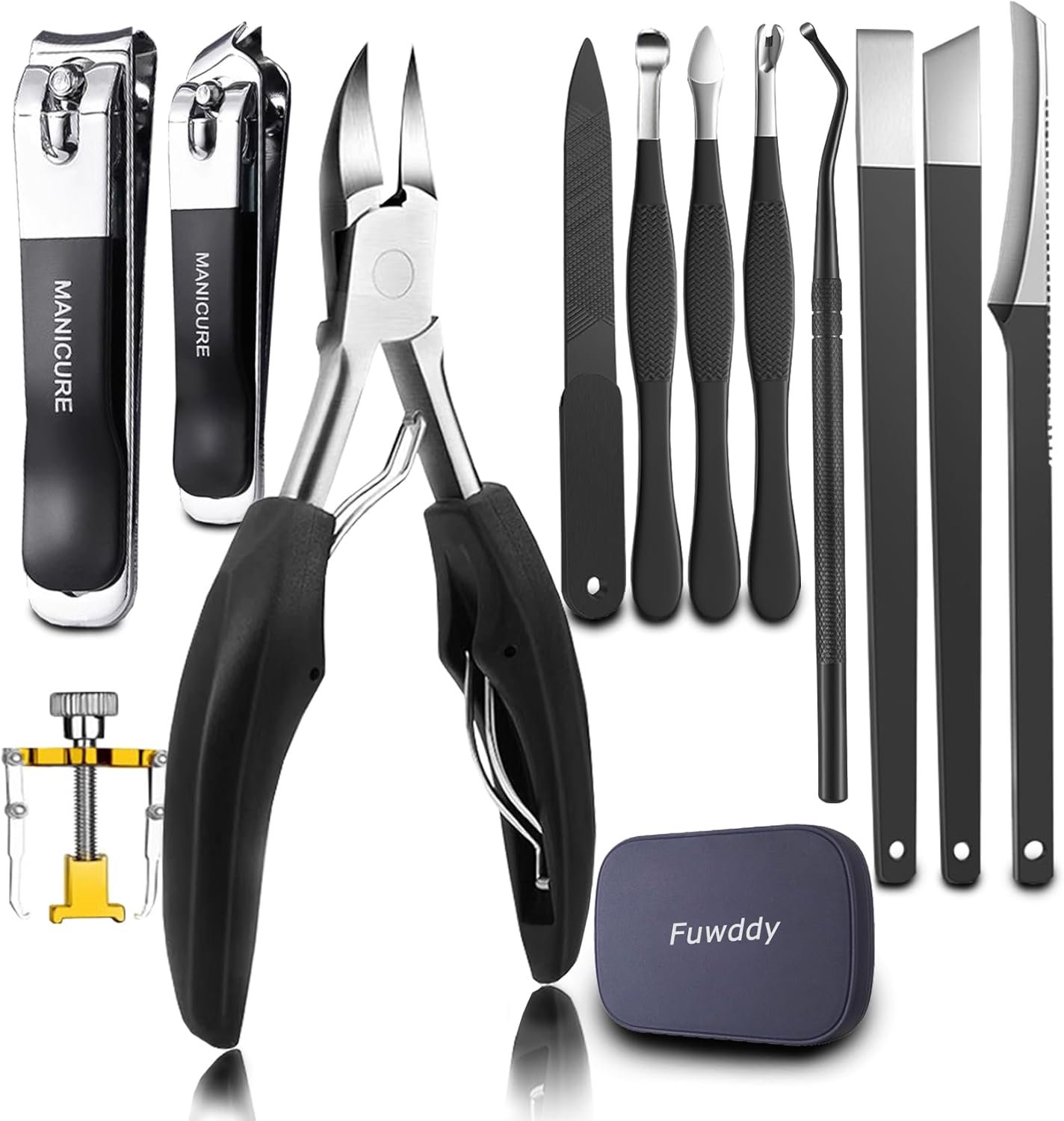 12-IN-1 MULTIFUNCTIONAL NAIL CLIPPER SET : This nail clipper set can meet all the needs of fingernail and toenail care. Includes ingrown toenail clipper, pedicure knife, fingernails cutter, nail file, ingrown nail lifter, cuticle pusher, dead skin fork, toenail corrector, ear cleaner tool, organizer box.