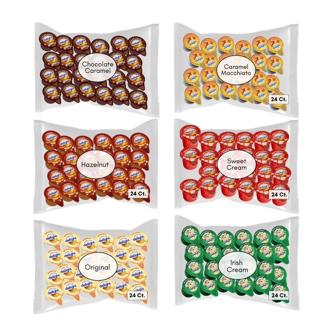 The International Delight Single Server Creamer Variety Pack contains 6 flavors specially curated for flavor variety and packaged for safe delivery. We professionally bag each flavor in food safe, machine sealed, 2 layer polypropylene and polyethylene bags for freshness, leak prevention and tamper evidence. You will receive 24 single serve creamers in 6 flavors, for a total of 144 non-dairy creamers.