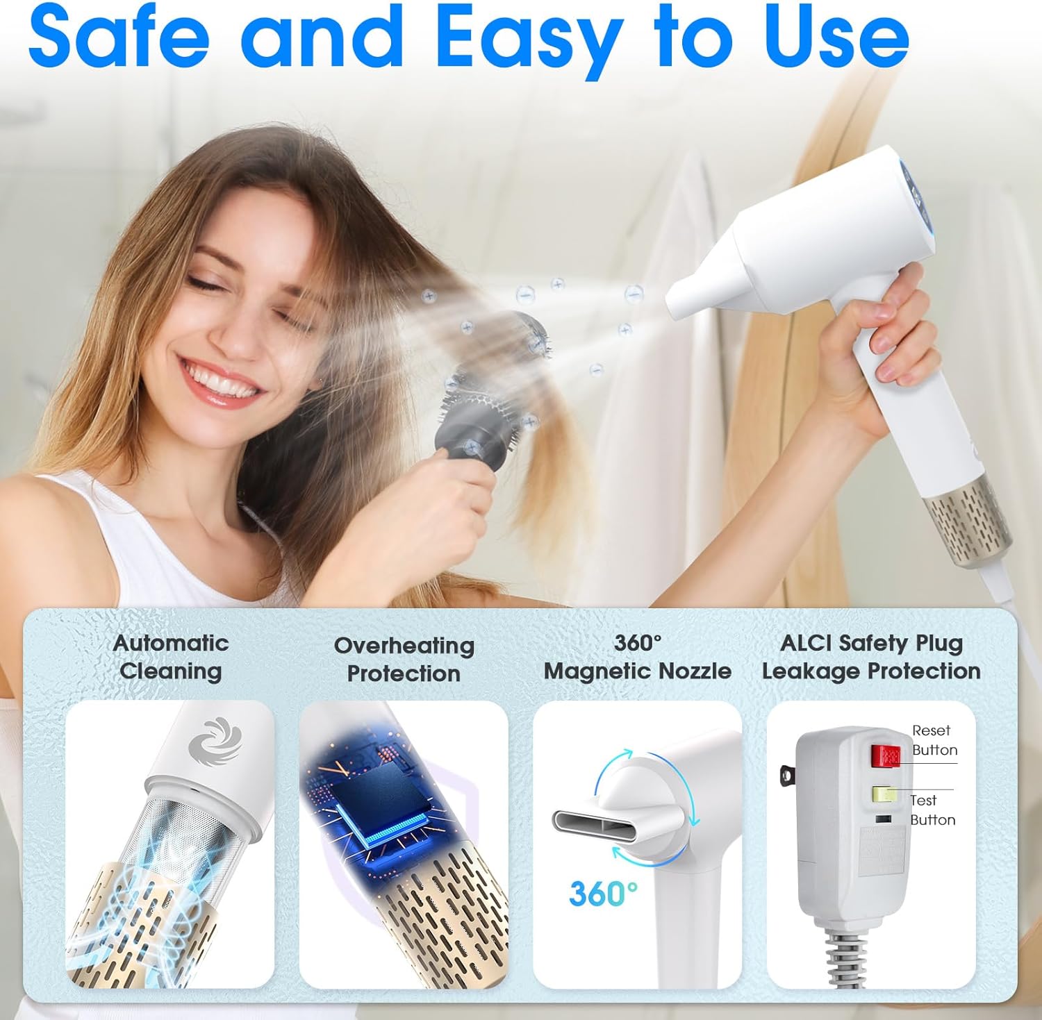 ✅【Safety & Automatic Cleaning Function】The blow dryer has ALCI safety plug to protect against overheating and electrical issues. This plasma hairdryer comes with double-layer magnetic suction nozzle that rotate 360° for prevent from burns. A 0.2mm filter mesh prevents hair from entering the motor, while the automatic cleaning function simplifies maintenance, effectively extending the lifespan of the hair blower. Press for 10 seconds to enter the cleaning mode. After 10 seconds of motor reversal, restore the motor to rotate