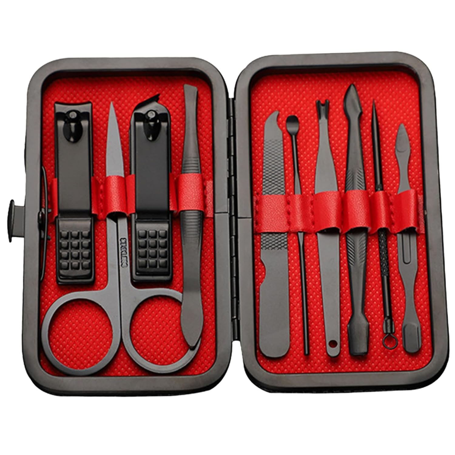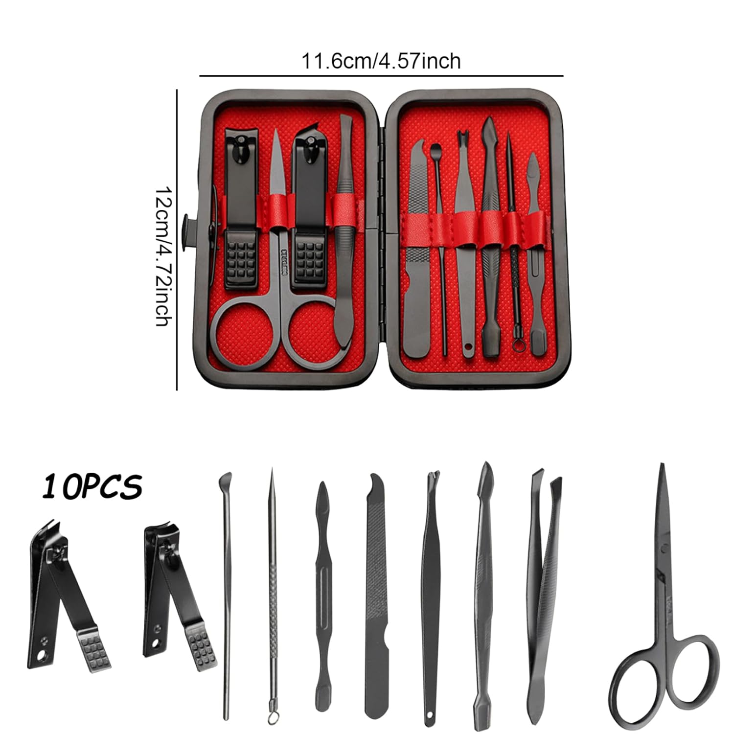 Complete Manicure Set for Daily Care: Experience top-notch foot, hand, and face care with our 10-piece manicure set. This meticulously designed set includes flat nail clippers, oblique nail clippers, Eyebrow scissors, Dead skin file, eyebrow tweezers, deak skin remover, Double pick, nail file, acne needle and ear pick. This manicure set is perfecr for hand care, toes nail care and face care.