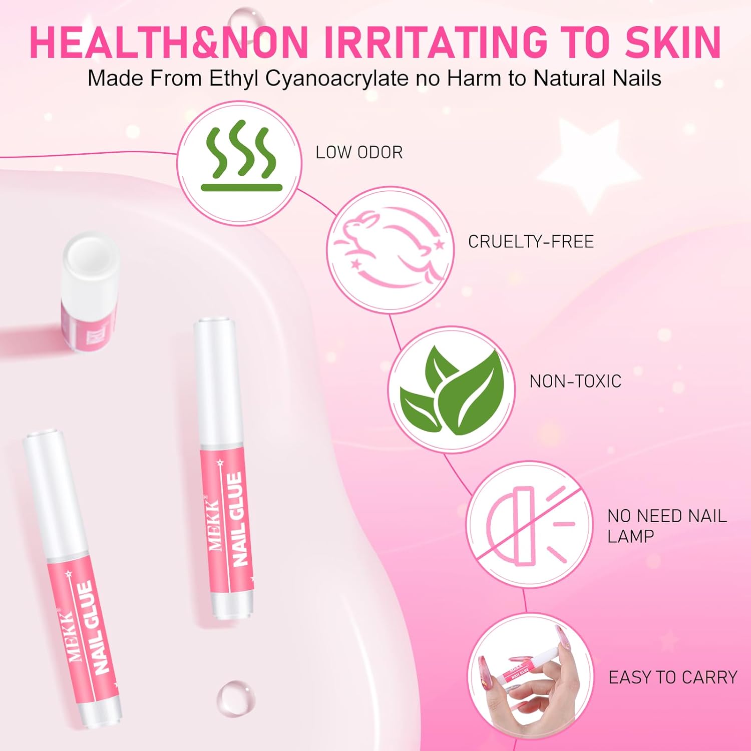 Healthy Material: MEKK nail glue is made with natural resin,ethyl cyanoacrylate, and is MSDS certified. The formula features low odor, low irritation, non-toxic ingredients, is free from formaldehyde, cruelty-free, and vegan—safe and gentle on natural nails. Its transparent texture dries clear without whitening, leaving a crystal-like finish