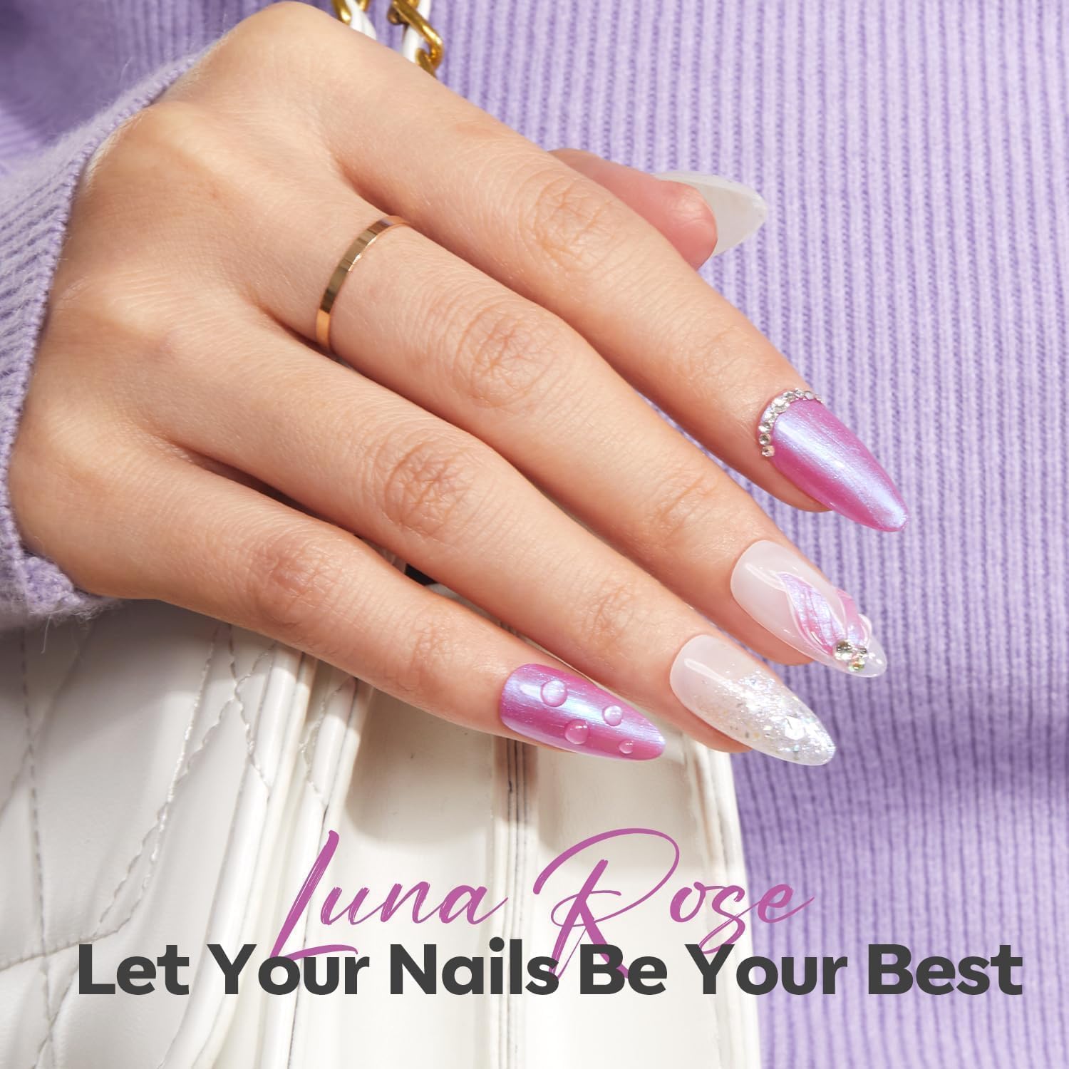 Chromatic Allure: modelones Luna Rose nail polish is a dreamy blend of soft, mystical purple with ethereal shimmer. Inspired by moonlit waves, this mermaid-like shade shifts and gleams with iridescent, color-changing qualities, creating an enchanting effect on your nails