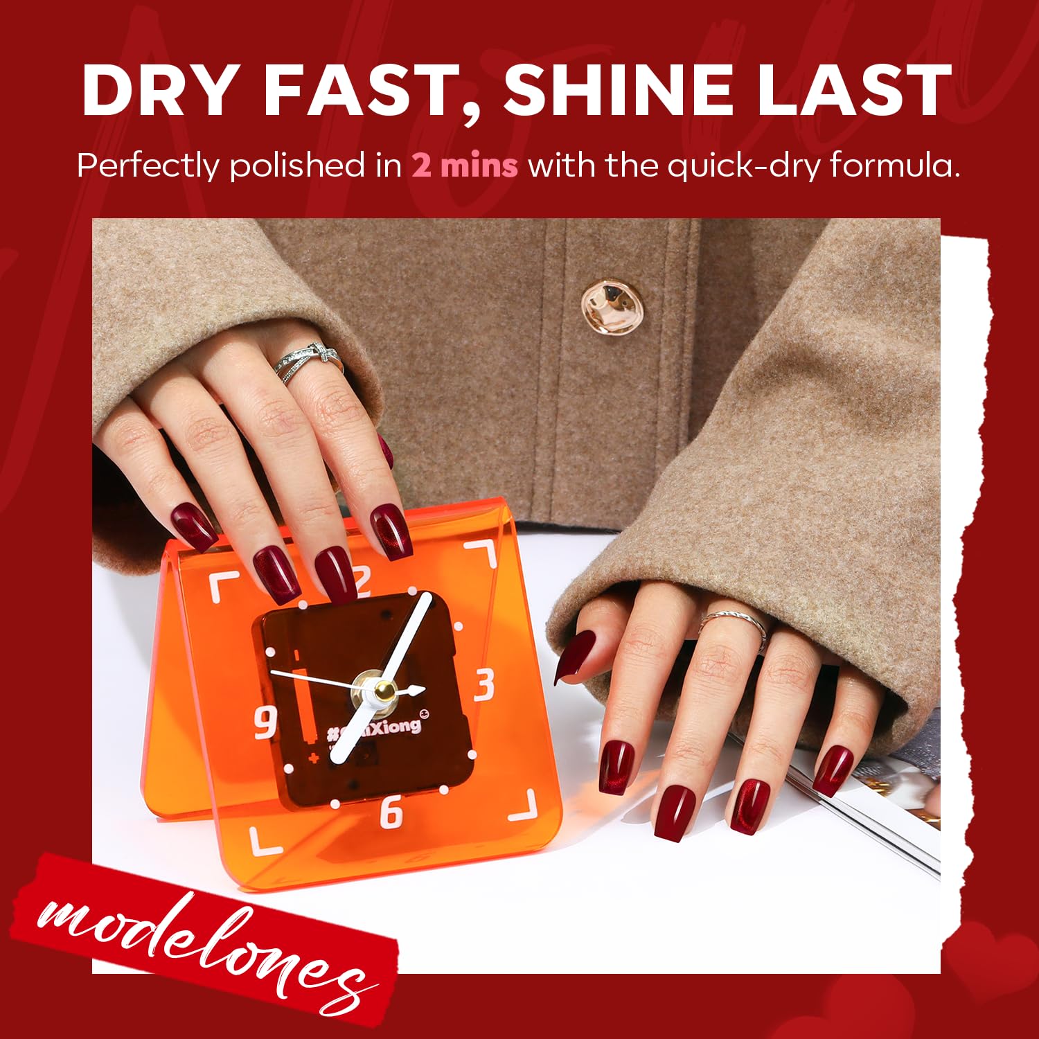 Quick and Efficient Drying: Say goodbye to long waiting times! Modelones Pink nail polish dries rapidly, saving you 30% more time compared to other brands. Each layer sets in just 90-120 seconds, allowing you to complete a full, two-layer application on both hands in approximately 15 minutes. Perfect for those who value both time and quality.