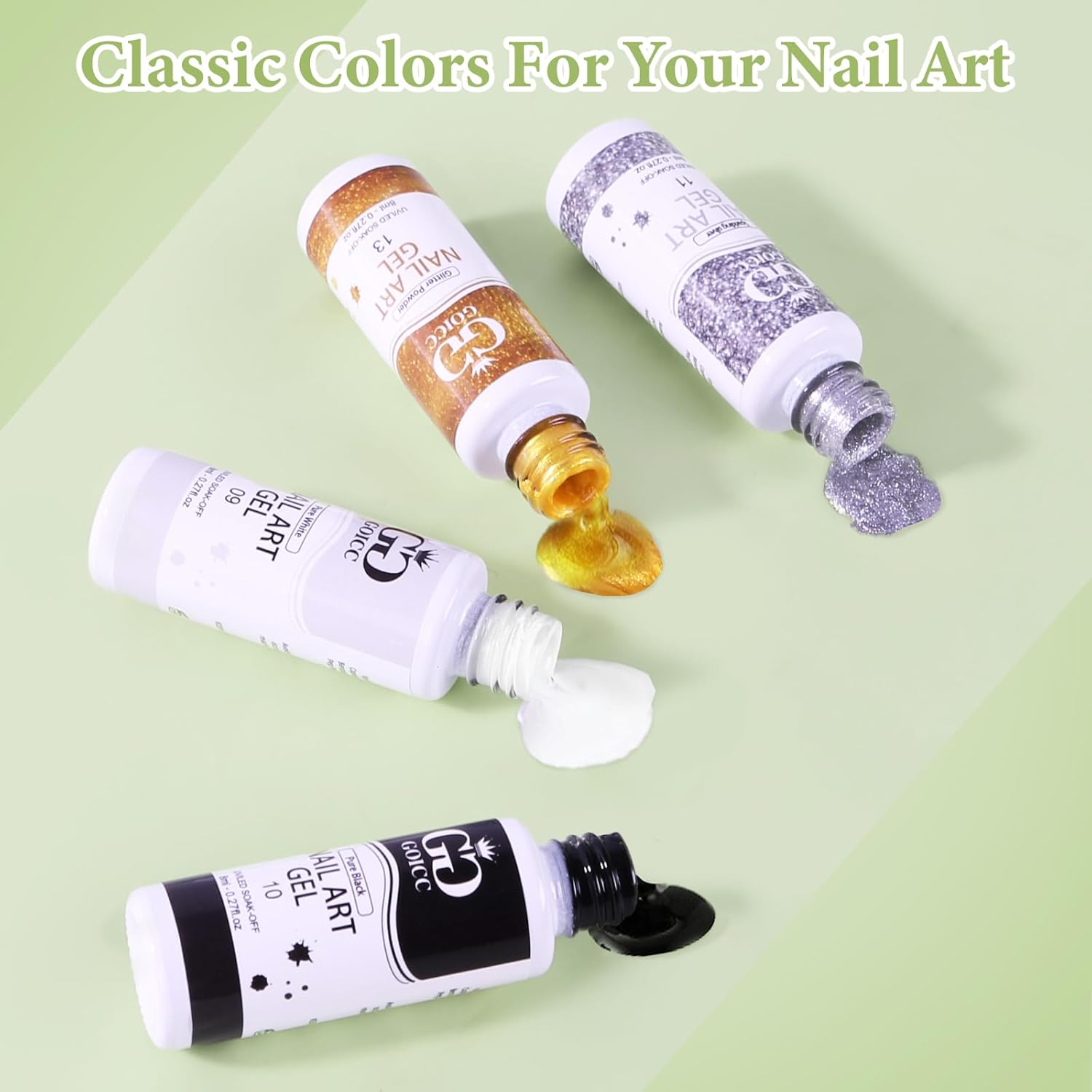 Get The Nail Art Polish Set in 4 Colors, Design Bright Nail Art: The gel nail art kit include:black white glitter silver. Colorful nail art can make people look bright and feel happy, perfect gel nail polish for summer and holidays.