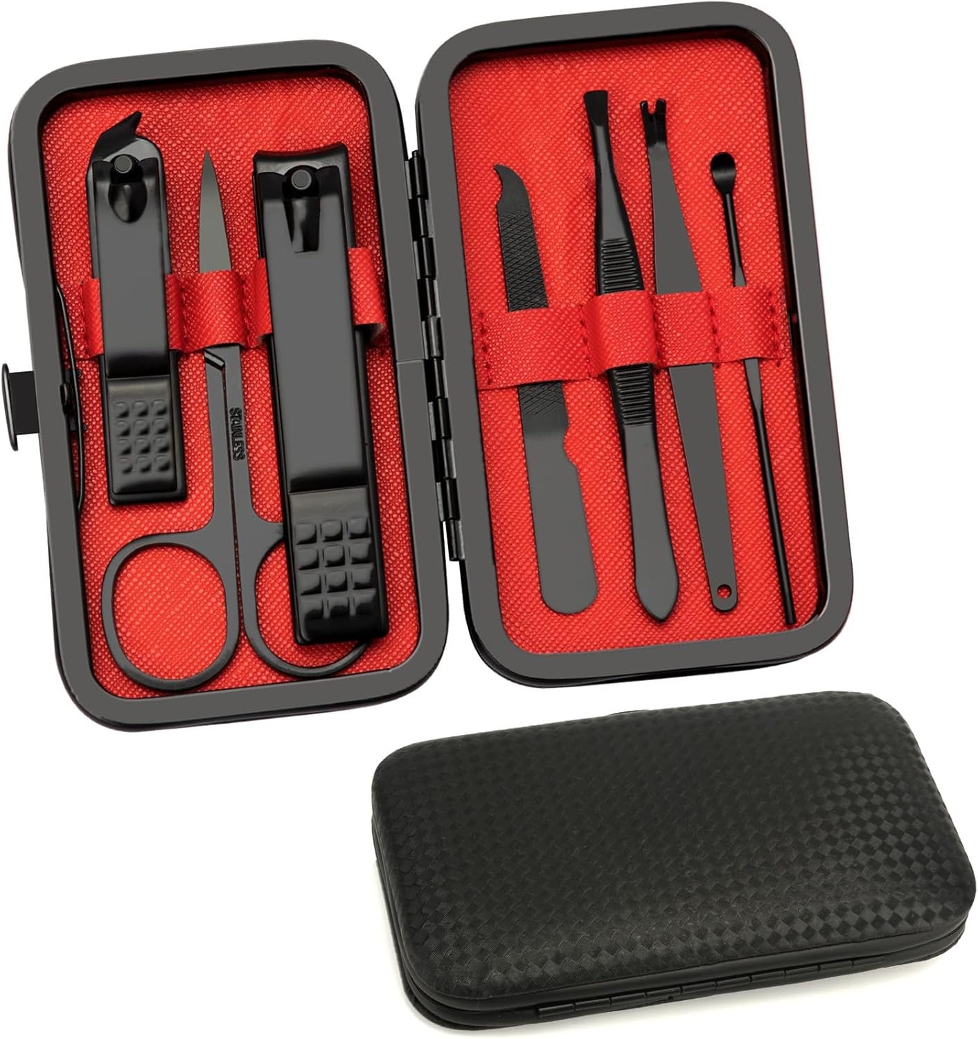 Elevate your grooming routine with this premium and comprehensive manicure set, featuring eight essential tools for nails and toenails. Crafted from top-grade stainless steel, each tool is not only aesthetically pleasing but also robust and sharp thanks to special cutting-edge technology. This all-in-one kit includes everything needed for hand, face, and foot care, making it a versatile addition to your personal grooming arsenal. The compact case, made of synthetic leather, opens with a simple press of a button, offering easy access and convenient storage. Its portable size makes it ideal for travel or on-the-go touch-ups. Packaged in an elegant box, this professional set makes for a stylish and thoughtful gift for loved ones. Whether you’re a man or woman, boy or girl, this kit offers a complete solution for all your nail care needs.