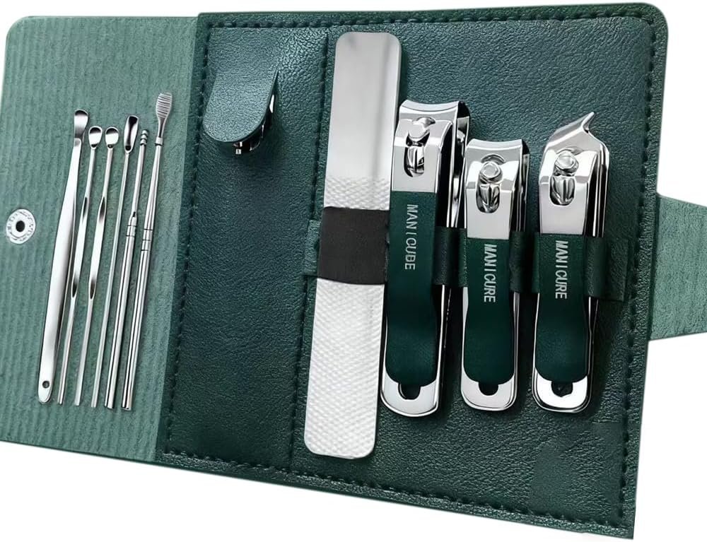 10-IN-1 ALL-IN-ONE GROOMING SOLUTION: This kit includes: large flat-mouth clipper (thick toenails), small flat-mouth clipper (dead skin/hangnails), diagonal clipper (cuticles/nail seams), nano nail file, and 6-piece ear canal care kit. Covers all manicure, pedicure and ear care needs.