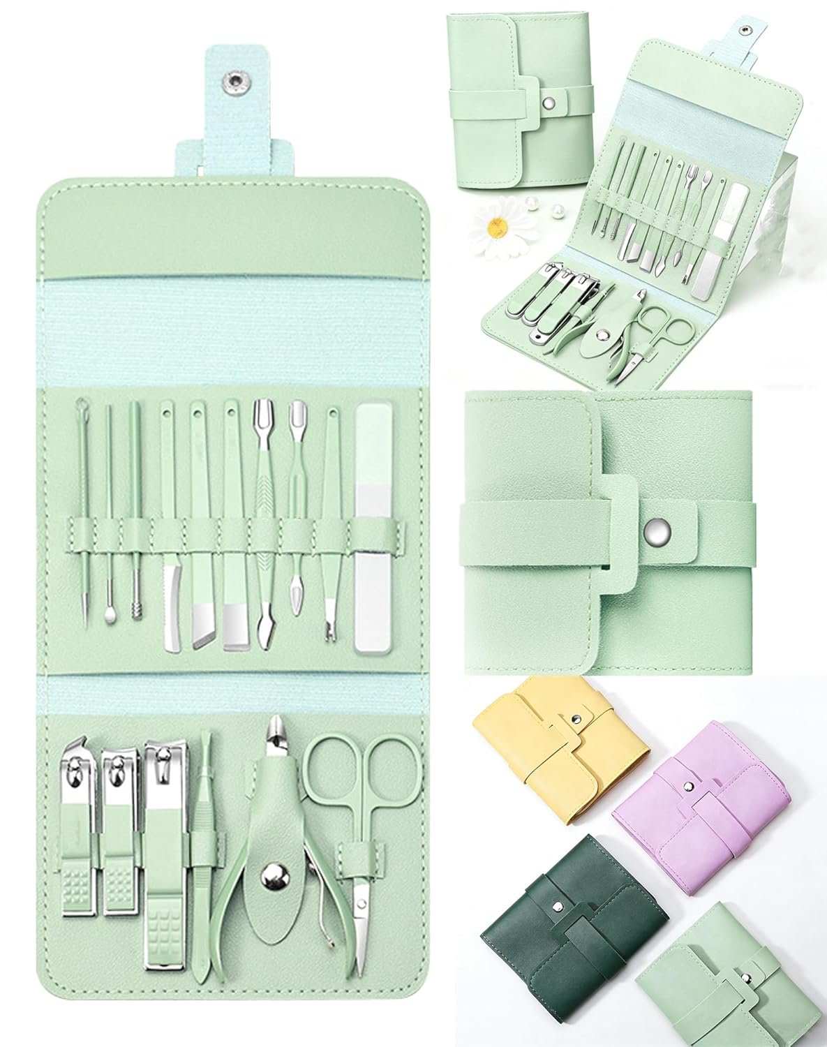 Portable Nail Clipper Set, Multi-Functional Stainless Steel Manicure Kit, Professional Manicure Grooming Kit, Complete Nail Cutter with Cuticle Care, Travel-Ready with PU Leather Case (Green-16pcs)