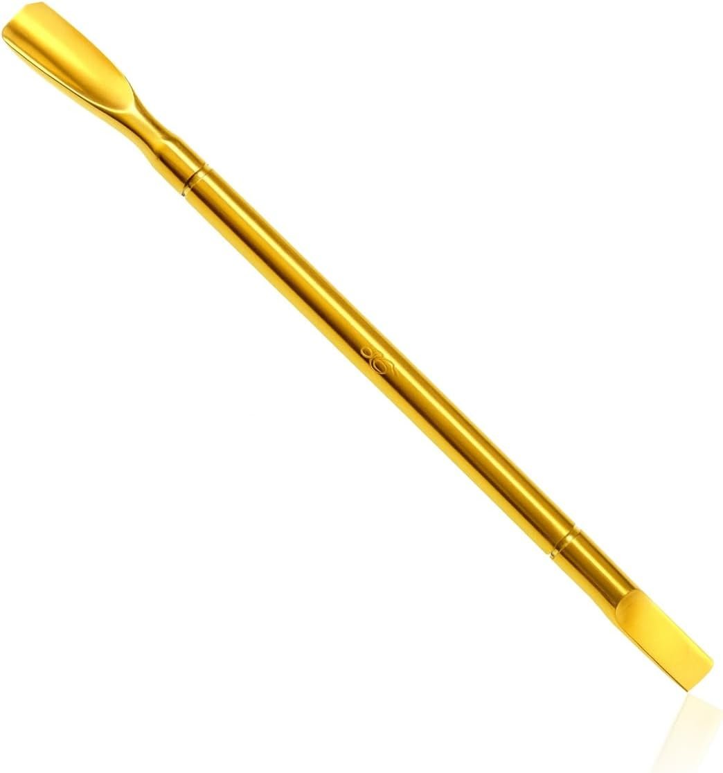 Discover the ultimate tool for professional-quality nail care at home. Our double-ended cuticle tool combines functionality with elegance, featuring a gentle paddle pusher and a precision blade for complete cuticle management. Crafted from durable gold-toned metal and measuring 14 cm, this slim, balanced implement offers optimal control for both nail technicians and enthusiasts. Its versatile design allows for effortless pushing and precise removal of excess cuticle, ensuring a salon-worthy finish every time. Elevate your manicure routine with this essential addition to your nail care kit, designed for comfort, precision, and long-lasting performance.