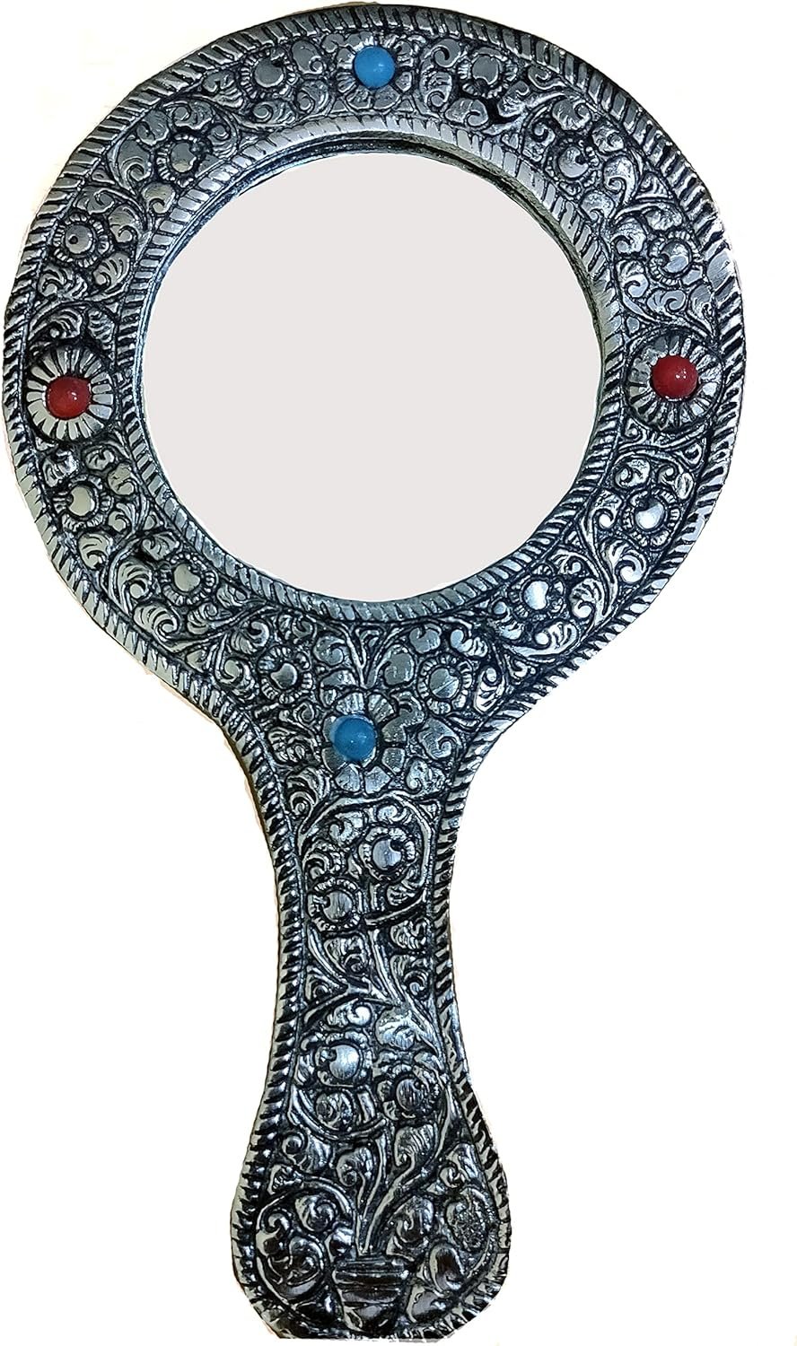 Rastogi Handicrafts German Silver Tone Purse Mirror Hand Mirrors Actress Mack-up kit Lovely Antique (Hand Mirror Design-1)