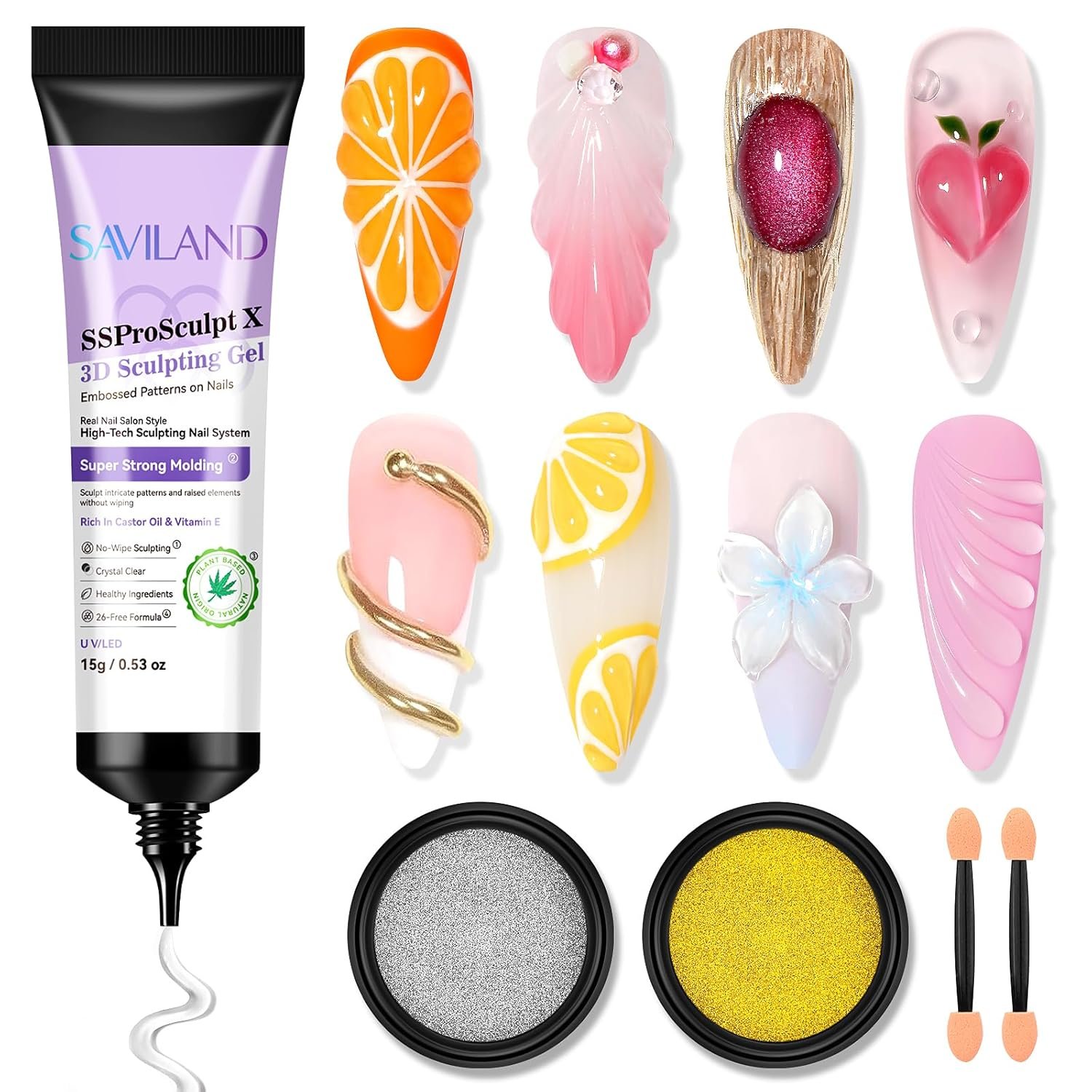 3D Nail Gel with Chrome Powder Set: Create versatile 3d nail art designs with our 3d gel nail kit, featuring 15g clear sculpting gel, gold and silver chrome powders and sponge sticks for flexible use at home or in nail salons. This all-in-1 3D gel manicure kit meets various nail art needs, ideal for both professionals and DIY enthusiasts for 3D gel nail art sculpture