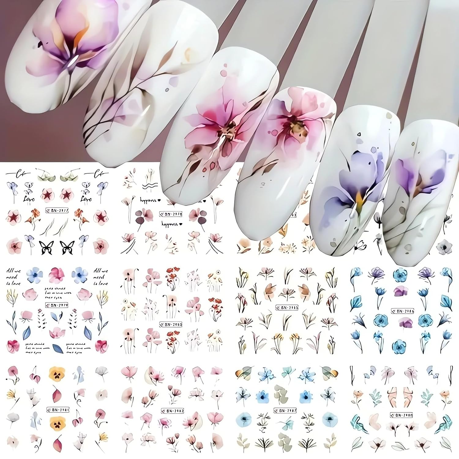12 designs of colorful flower nail art stickers, full of fashion and elegance.
