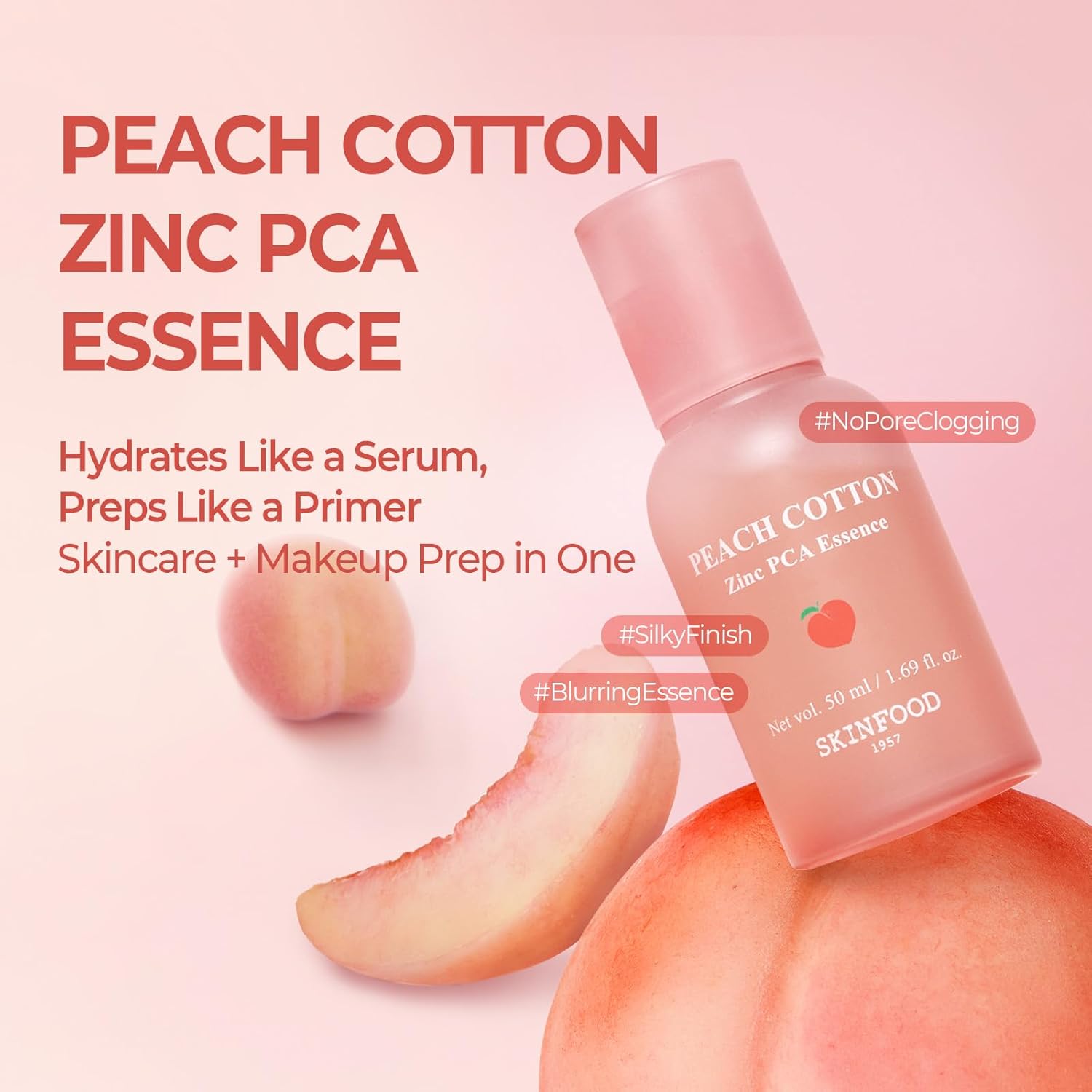 The SKINFOOD Peach Cotton Zinc PCA Essence Serum Primer. Inspired by the soft, juicy texture of peaches, this multi-tasking product combines the benefits of a hydrating face serum with the smoothing power of a blurring primer—delivering skin that looks fresh, balanced, and makeup-ready in one easy step.