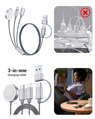 【3-in-2 Charging Design】3 in 2 charging cable provide 6 charging methods — USB C/A to iWatch charger, USB C/A to Lightning cable, and USB C/A to Type C cable. The multifunctional charger supports charging 3 devices simultaneously using a USB C/A adapter, and is compatible with all iWatch Ultra series 9/SE/8/7/6/5/4/3/2/1. The Lightning connector is compatible with iPhone 14/13/12/Pro/Max/iPad, and USB C is suitable for iPhone 15 Charger/iPhone16 Charger/iPhone 16 Accessories/iPhone 16 Adapter/ PS/2 Cables
