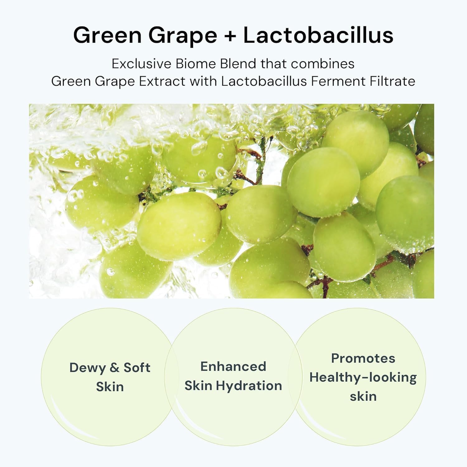 Dewy & Soft Skin: Exclusive Biome Blend combines green grape extract with Lactobacillus Ferment Filtrate, enhances skin hydration promotes healthy-looking skin, and boosts overall skin health, delivering a visibly refreshed and balanced complexion.