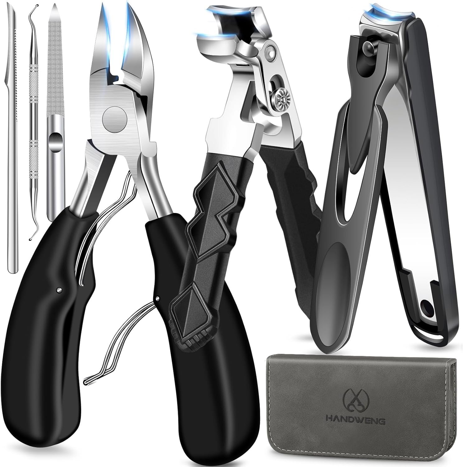 6-IN-1 PROFESSIONAL NAIL CLIPPER SET: Includes 1 x Large Podiatrist Toenail Clipper, 1 x Angled Head Nail Clipper, 1 x Fingernail Clipper with Catcher, 1 x Pedicure Knife, 1 x Ingrown Nail Lifter, 1 x Nail File — all packed in an elegant leather case. This set is perfect for trimming thick, ingrown toenails, fingernails, and cuticles, providing a comfortable and precise grooming experience for seniors, men, women, and adults.